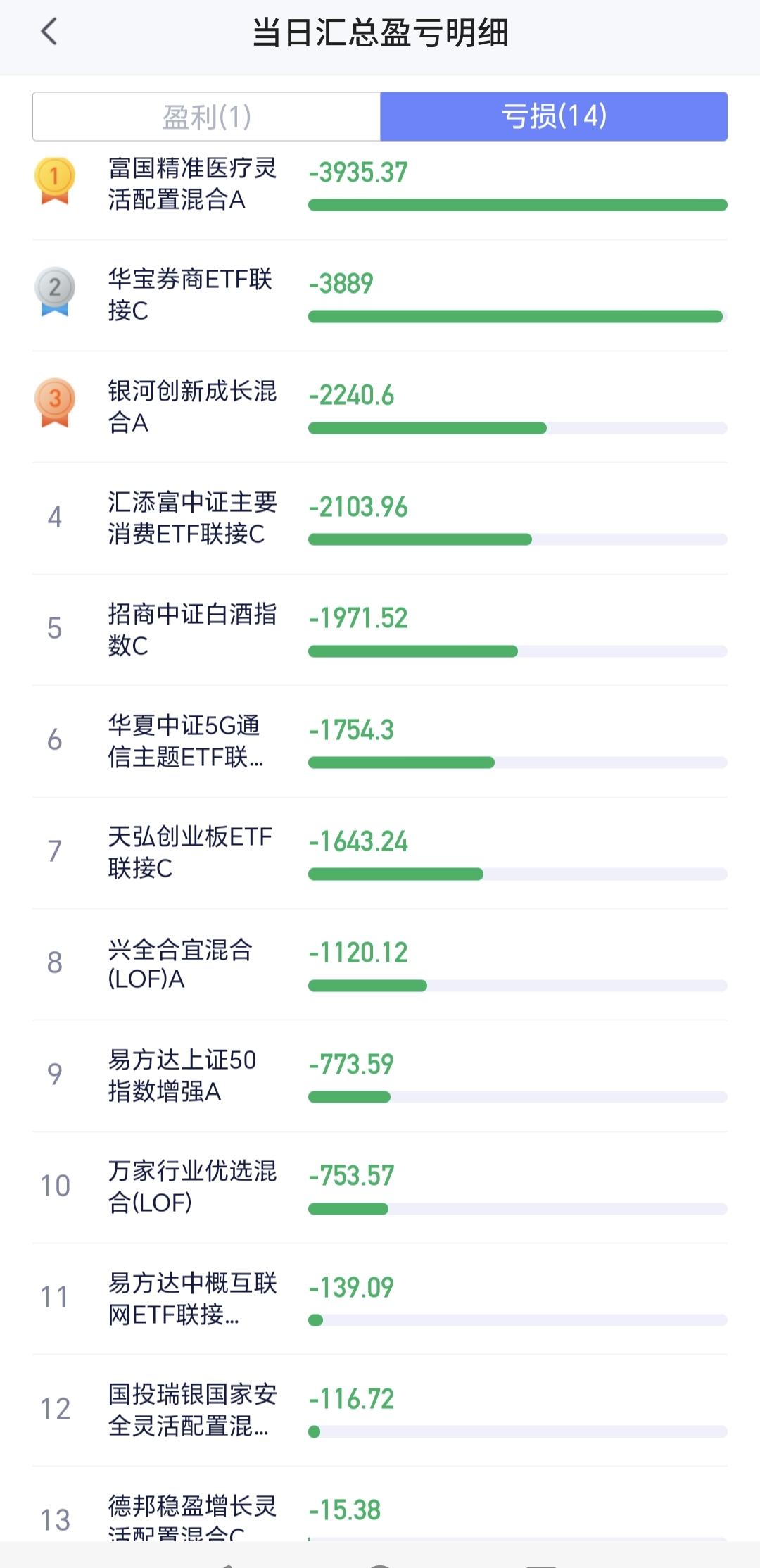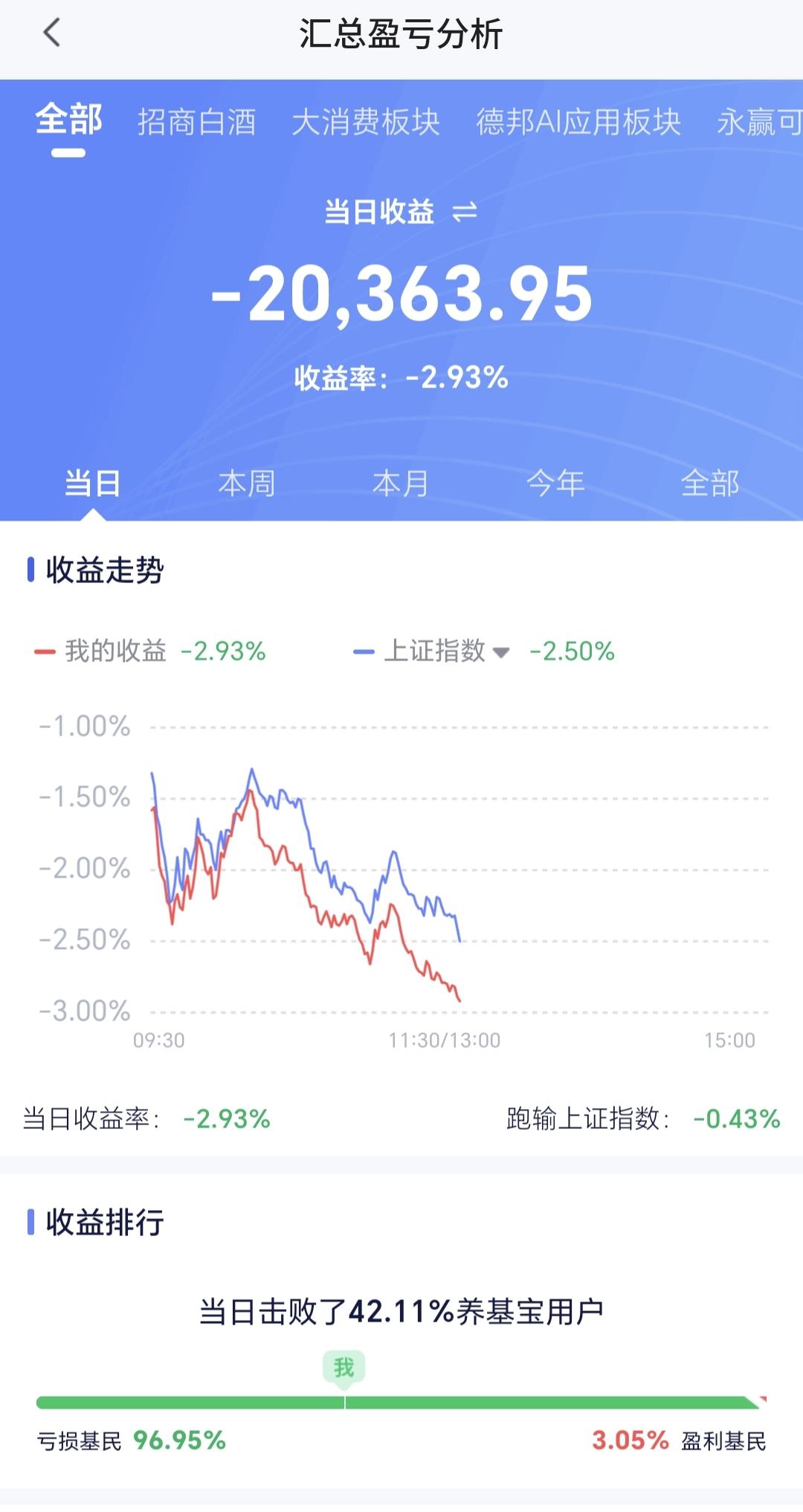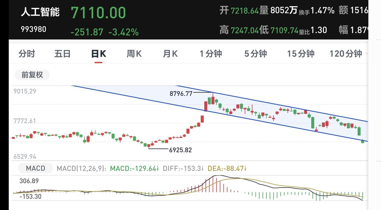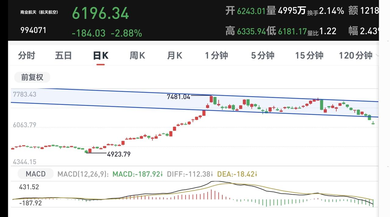 基金:市场有没有见底 今天市场低开以后小幅度冲高,然后是继续回落杀跌,中午收盘的时候三大指数都是大跌,下跌幅度都在2%以上,创业板指下跌了2.44%,收于3270点,上证指数下跌了2.50%,收于3858点。 整个股票市场,上涨489家,下跌4981家,涨停37家,跌停29家,上涨家数少于下跌家数。 持有的基金中,中午收盘的时候,估值盈利的只有新能源汽车板块,估值亏损金额最大的三个板块是:创新药板块,证券板块,芯片半导体板块,估值整体亏损了20363元。 整个基金市场,上涨4693家,下跌14951家,没有上涨幅度超过5%的基金,下跌幅度超过5%的100家。 图10是今天板块的上涨排行榜,上涨幅度最大的三个板块是:煤炭板块,锂矿板块,债基板块,图11是今天板块的下跌排行榜,下跌幅度最大的三个板块是:黄金板块,农林牧渔板块,交通运输板块,图12是今天基金的加仓和减仓人数,加仓815373人,减仓1038427人,加仓人数少于减仓人数。 整个市场主力资金净流入最多的三个板块是:汽车板块,煤炭板块,智能汽车板块,主力资金净流出最多的三个板块是:高端制造板块,电子板块,esg板块。 1:中午收盘的时候,黄色线在蓝色线下方带两条线之间的场合,并不是特别大,下午继续观察两条线位置之间会不会有变化。 2:两市累计成交14956亿,相比于上周五同期放量了1%,上午开盘以后,有一波恐慌盘涌出,但在反弹的过程当中,并没有资金进场,第二轮的杀跌并没有见到恐慌盘。 没有杀出恐慌盘的情况之下,有两种可能性,一种是继续杀跌,直到杀出恐慌盘为止,第二种是上拉诱多,诱骗资金进场以后再进行杀跌,具体会用哪一种方式,现在还不知道,需要继续观察。 3:商业航天板块中午收盘的时候估值下跌了1.36%,是连续第三个交易日下跌,持有人数在所有板块当中排名第六位。 商业航天板块日线级别处于下跌通道中,上周五下跌跌破了日线级别下跌通道的下轨线,今天是继续下跌,进入了加速下跌状态,刚进场的人需要耐心等待。 商业航天板块周线级别处于上涨通道中,今天的下跌并没有跌破这个周线级别上涨通道的下轨线,但现在的位置距离这条下轨线比较近,近期观察会不会有效破位这条下轨线,如果有效破位周线级别上涨通道的下轨线,长线持有的人需要注意风险。 4:人工智能板块现在盘中估值下跌了3.17%,是连续第三个交易日下跌,持有人数在所有板块当中排名第11位。 人工智能板块日线级别处于下跌通道中,今天下跌跌破了这个下跌通道的下轨线,如果是有效破位这条下轨线,就进入了加速下跌走势。 人工智能板块上周下跌跌破了周线级别上涨通道的下轨线,今天是继续下跌,人工智能板块周线级别上涨趋势有可能已经被改变,长线持有的人需要注意风险。 到现在为止还没有看到市场止跌的迹象,也就是左侧的交易信号还没有出现,更没有谈右侧交易信号了,什么是左侧交易和右侧交易,见上一篇文章。 如果市场采用拉涨诱多的方式,在上涨的过程当中还是需要观察有没有成交量的有效放大,请注意,是要观察成交量的有效放大,而不是成交量的放大,没有有效放大的成交量是没有用的,总体上看,这么快的下跌速度不容易很快停下来,即使有反弹,反弹结束以后大概率还是会继续下跌,反弹最快下午就会到来,也就是市场还没有真正的见底。 我会密切注意市场走势,有观点以后会第一时间分享给大家,大家帮忙评论点赞,转发和分享。