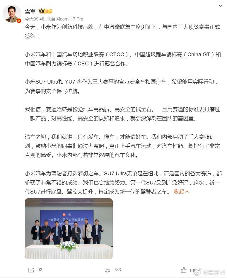 去年我们就猜测过,小米是可以跟知名汽车赛事合作的,让小米的车子在场上发挥作用。现在呢,还真是让我们说中了,小米汽车跟CTCC、China GT、CEC这三大顶级赛事冠名合作,SU7 Ultra成为安全车,YU7则作为医疗车,大家也可以看看改装之后的车子,还是很有专业范儿的。在这儿大胆畅想一下,10年后,20年后,中国跟欧美一样成为赛车文化大国,大多数人都可以轻松体验速度与激情,这其中肯定有小米的一份功劳吧?小米与三大顶级赛事签约雷军回应小米与三大顶级赛事签约 小米汽车
