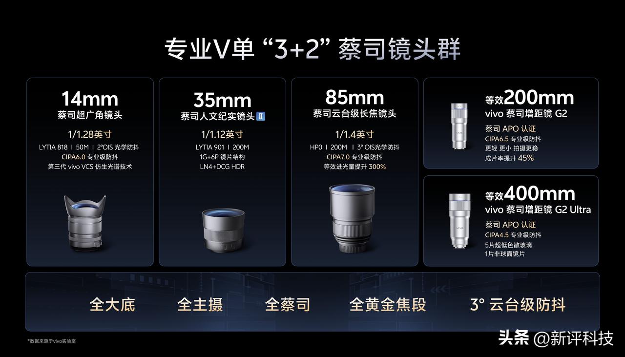 今天上午,vivo举行了X300系列影像技术沟通会,全新的X300 Ultra在硬件和软件上都有升级。 主摄继续沿用35mm人文焦段,将首发搭载1/1.12英寸、2亿像素的LYTIA-901,采用1G+6P的镜片结构,还有LN4和DCG技术加持,动态范围的表现值得期待。 潜望长焦等效85mm,传感器采用2亿像素、1/1.4英寸的HP0,支持CIPA 7.0级防抖和3°OIS光学防抖,为焦距更长、画质更好的全新增距镜打下了体验基础。 超广角依旧采用超大底,等效14mm,传感器为5000万像素、1/1.28英寸的LYTIA-818,搭载了第三代VCS技术,并且支持2°OIS光学防抖和CIPA 6.0级防抖,畸变控制和画质都有保障。 除此之外还搭载了蓝图原色摄像头,12通道+500万像素的组合,相比市面上现有的方案都更强,色彩还原更精准。 vivo作为手机增距镜的引领者,这次也会推出通过蔡司APO认证的蔡司增距镜G2和G2 Ultra,G2等效200mm,重量约为153g,仅为上代的73%,长度也只有上代的86%,支持CIPA6.5级防抖,成片效率提升45%。 G2 Ultra的等效焦距更是来到了400mm,支持CIPA 4.5级防抖,重量约为248g,使用了非球面镜片,来保证更高的画质。 软件方面也构建起了“蓝图人像+AI影像+全新胶片+色彩科学”的矩阵。视频能力也全面进化,支持全链路全焦段的4K 120fps 10bit Log规格,全新交互和专业视频拓展套件也将大幅提升视频拍摄体验。 大家期待这次vivo X300 Ultra的影像表现吗?vivo X300 Ultra专业V单 vivo X300s超能小V单