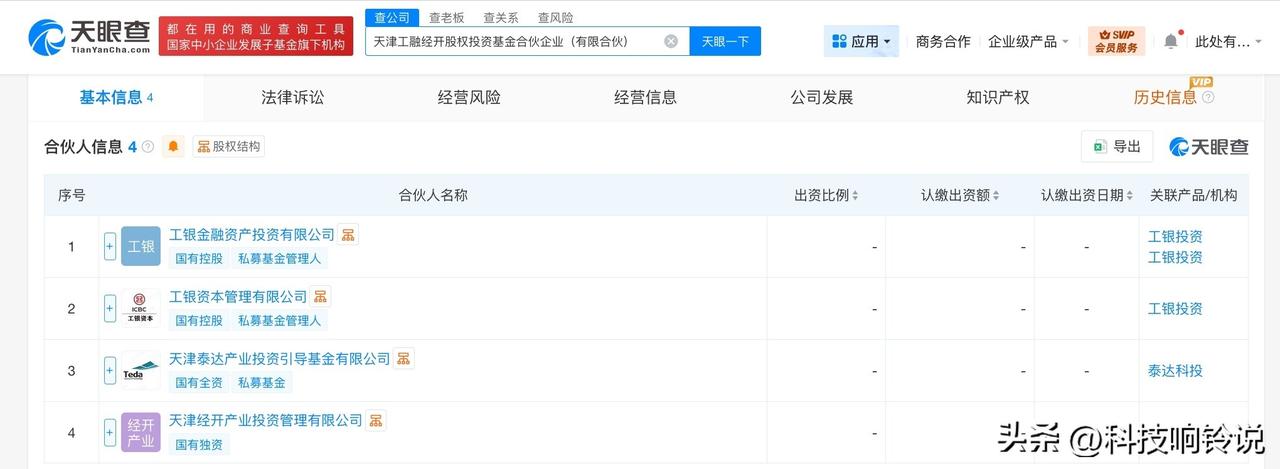 【工银投资等在天津成立股权投资基金 出资额10亿】 天眼查工商信息显示,近日,天津工融经开股权投资基金合伙企业(有限合伙)成立,执行事务合伙人为工银资本管理有限公司,出资额10亿人民币,经营范围为以私募基金从事股权投资、投资管理、资产管理等活动。合伙人信息显示,该基金由工银金融资产投资有限公司、工银资本管理有限公司、天津泰达产业投资引导基金有限公司、天津经开产业投资管理有限公司共同出资。 天眼查信息: