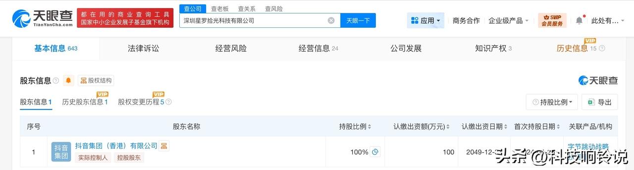 【抖音旗下星罗拾光公司增资至约187.8亿 抖音旗下星罗拾光公司半年增资170亿】 天眼查工商信息显示,近日,深圳星罗拾光科技有限公司发生工商变更,注册资本由约95.1亿人民币增至约187.8亿人民币,增幅约97%。 该公司成立于2022年9月,法定代表人为石玉磊,经营范围包括技术服务、技术开发、技术咨询、技术交流、技术转让、技术推广,信息系统集成服务等。股东信息显示,该公司由抖音集团(香港)有限公司全资持股。值得一提的是,该公司近半年内已连续三次增资,注册资本从17.65亿人民币一路增至约187.8亿人民币。 天眼查信息: