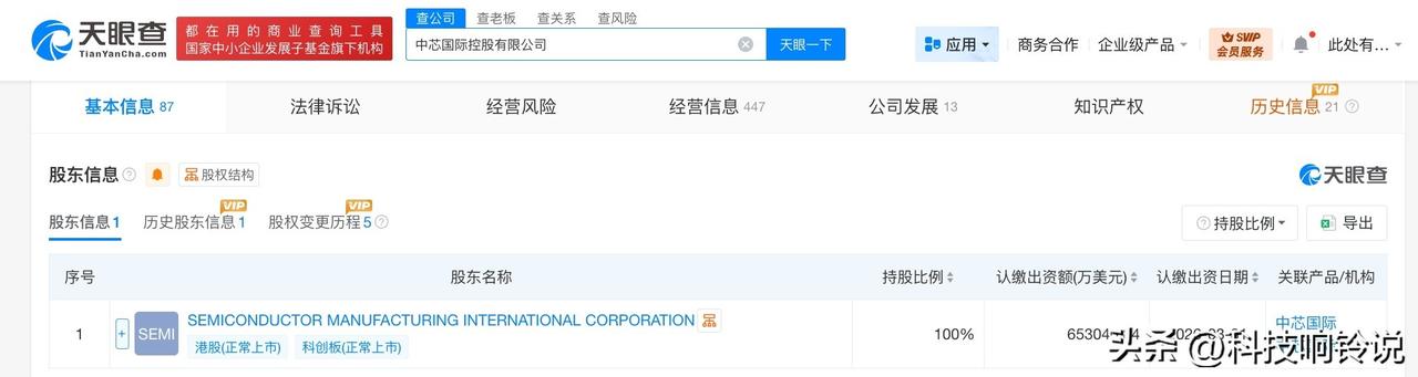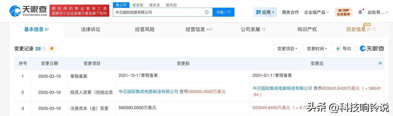 【中芯国际控股增资至约65.3亿美元 增幅约10%】 天眼查工商信息显示,近日,中芯国际控股有限公司发生工商变更,注册资本由59.5亿美元增至约65.3亿美元,增幅约10%。 该公司成立于2015年7月,法定代表人为刘训峰,经营范围包括在国家允许外商投资的领域依法进行投资、集成电路产品的批发、进出口、佣金代理及相关配套业务等。股东信息显示,该公司由中芯国际(688981)全资持股。 天眼查信息:
