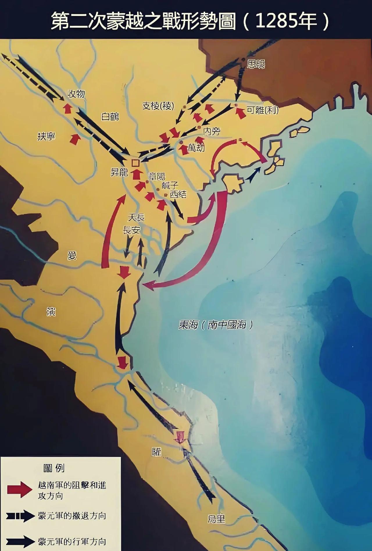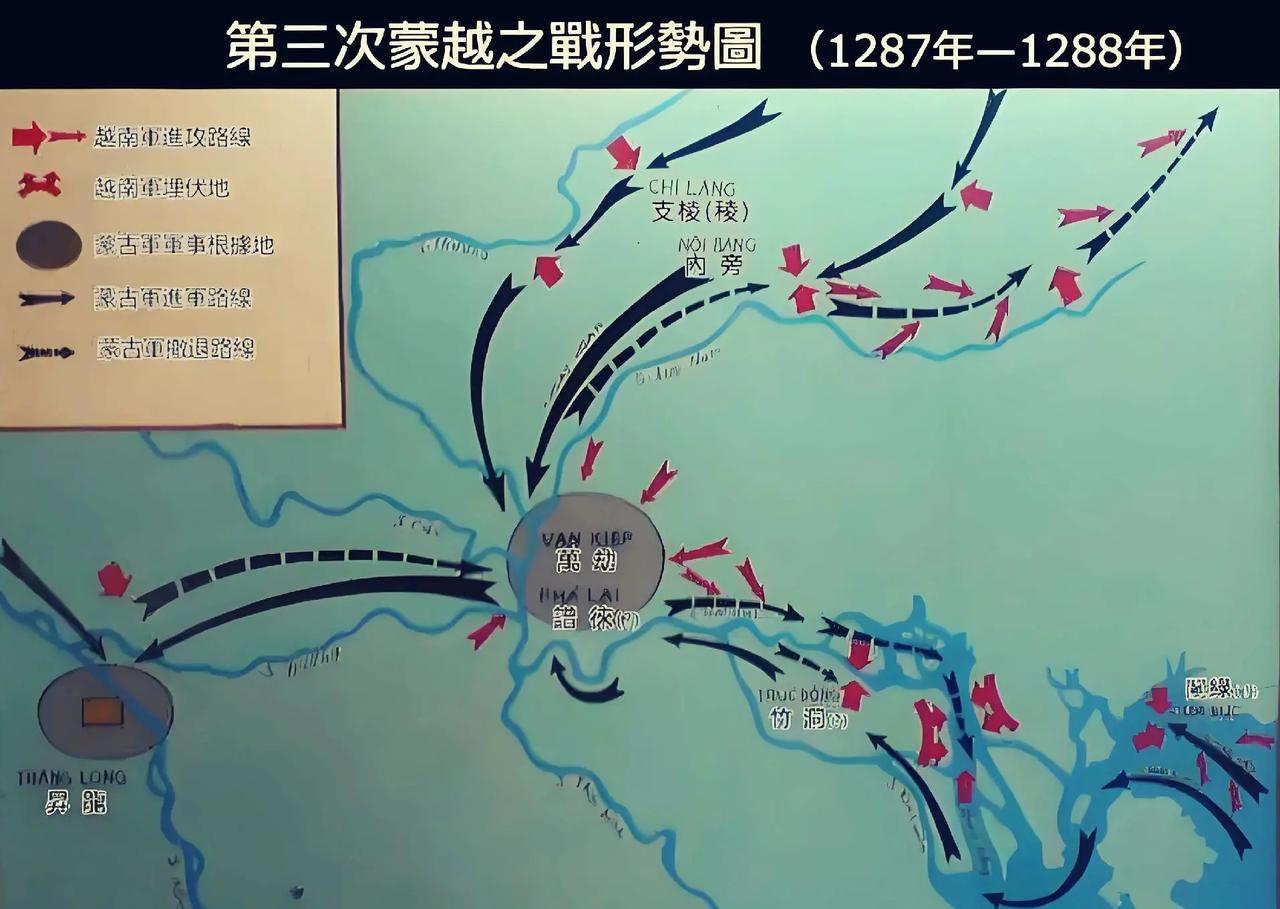 历史进入13世纪,蒙古崛起,打遍亚欧大陆。对于一个小小的安南并不放在眼里,忽必烈还在未登上汗位之前,就想着攻下了大理再顺手拿下安南。于是,在1257年,忽必烈派手下大将兀良哈台(蒙古开国大将速不台之子)征讨安南。也是一样,初期进展顺利,并占领了陈朝都城升龙(今河内),其国王弃城而逃。但由于天气炎热,蒙军水土不服,疫病流行,兀良哈台在升龙驻军仅九天就班师回了云南。而越南陈朝则请罪内附,愿为藩属。 忽必烈建立元朝之后,四处征战,当然也没忘了安南,也是想将其纳为直辖郡县。分别在1285年、1286年两次派自己第九子、镇南王脱欢征讨安南。都是跟第一次一样,初期进展顺利,但时间一长,粮草不济,人员不适应当地气候,造成大量非战斗减员。再加上陈朝军队利用元军不擅丛林山岳作战的弱点,出动小股兵力不断袭扰元军。同时,还在元军撤退之路上进行伏击,致使元军损失不小,有多名将领中毒箭阵亡,或是被其俘虏。元军的第三次征讨也在1287年撤出,还是没能将安南收为郡县。至1288年,越南陈朝君主派使臣上表称臣纳贡,永为藩属,战火方熄。