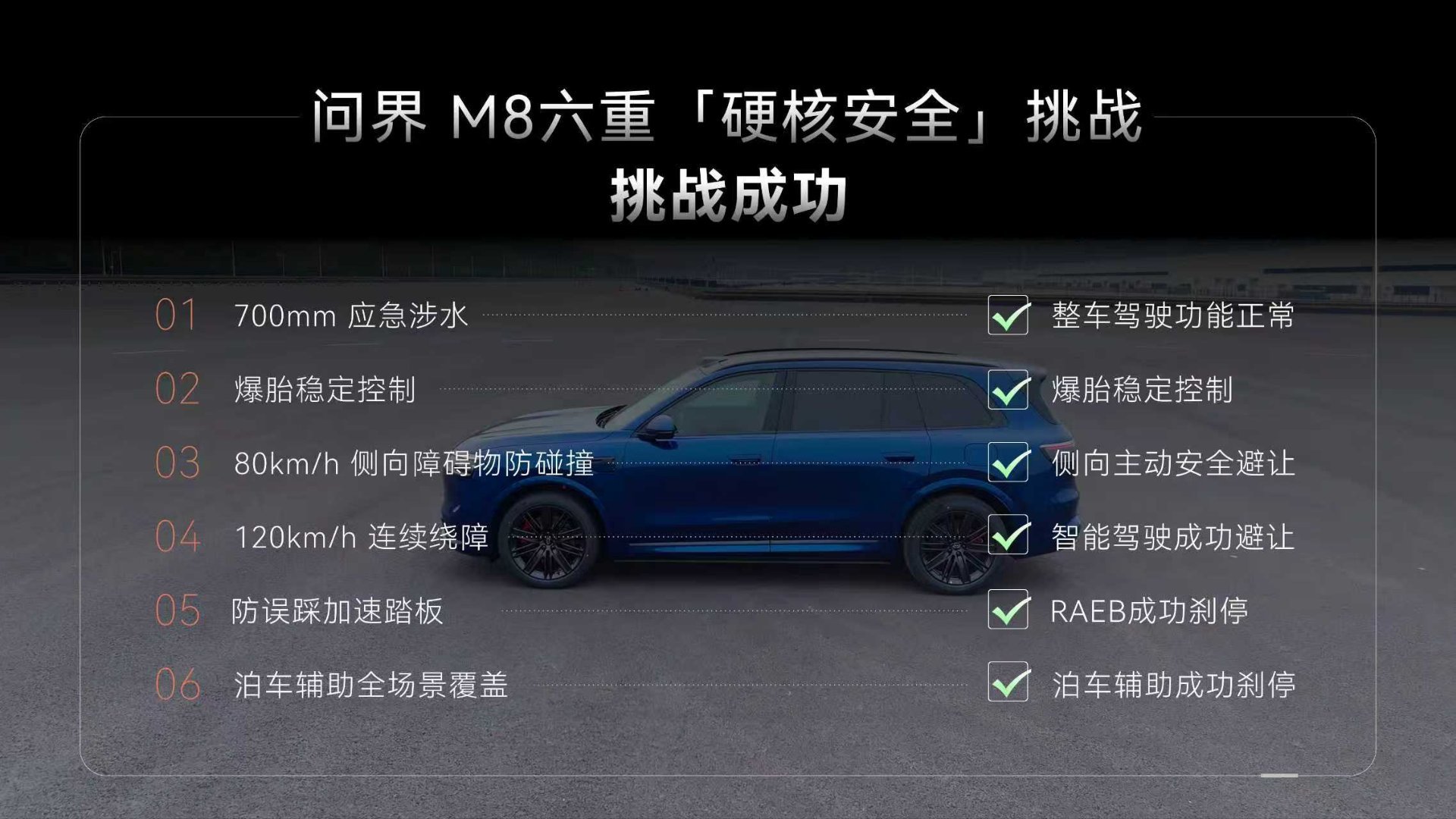 问界M8六重安全挑战曝光 问界M8这波安全实测,有点东西。六重挑战硬核拆解,700mm涉水:整车功能正常。爆胎稳定控制:稳住了!80km/h侧向防碰撞:主动避让。120km/h连续绕障:智驾成功闪避。防误踩踏板:RAEB紧急刹停。泊车全场景:辅助刹停到位。