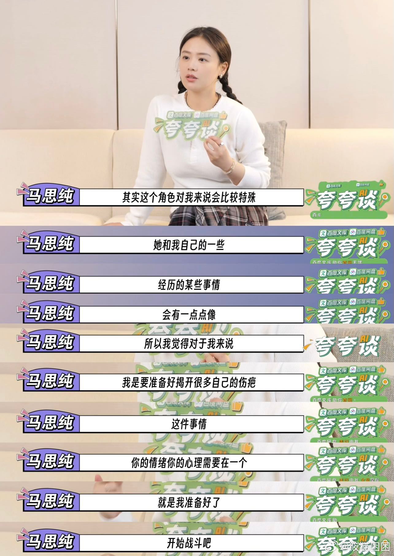 马思纯饶雨瓷人设马思纯新戏做好了揭开伤疤的准备马思纯在百度文库网盘夸夸谈里认真聊起新戏,为了把饶雨瓷演活,她坦然面对过往,用心打磨每一处情绪,百度文库GenFlow里还有更多她对角色的细腻理解,真诚又让人心疼。