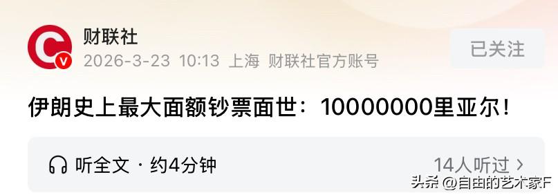 伊朗津巴布韦化,发行1000万面值新钞,兑换人民币仅值53元 3月23日,为了应对国内的通胀,伊朗发行面值1000万里亚尔的新钞,按照实时汇率计算1000万伊朗里亚尔只能兑换7美元,约合人民币¥53元。 这张新币是为了取代,伊朗央行二月份发布的500万亚里尔,发行宗旨也非常的简单,是为了确保大家获得足够的纸币进行消费。 而伊朗纸币短缺的原因,在于美国和以色列将伊朗银行纳入打击基础。所以纸币发行之后,伊朗民众立马在银行取款机面前都已经排成了长队。而为了缓解民众有钱取不出来的恐慌,伊朗政府正在逐步恢复线上支付。 除此之外,在战争开始之后,伊朗的贸易线路基本上已经被切断,通胀高达47.5%,为了害怕引起不必要的动乱,伊朗启动了一项食品券计划,向8000万伊朗人提供每月信用额度,以便在指定商店购买主食安抚民众。 目前由于正在战争期间,伊朗整体社会秩序稳定,民族情绪高涨未见解社会紊乱。但是长久下去,高通胀对于伊朗人来说是非常不利的,这一点伊朗政府也不得不考虑
