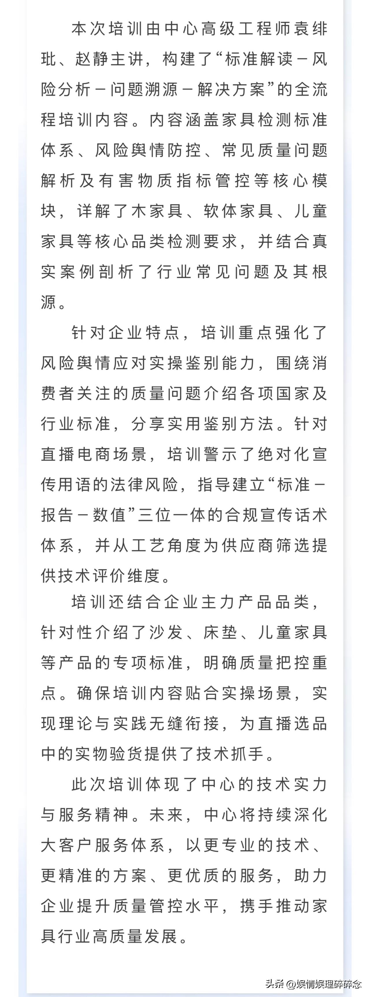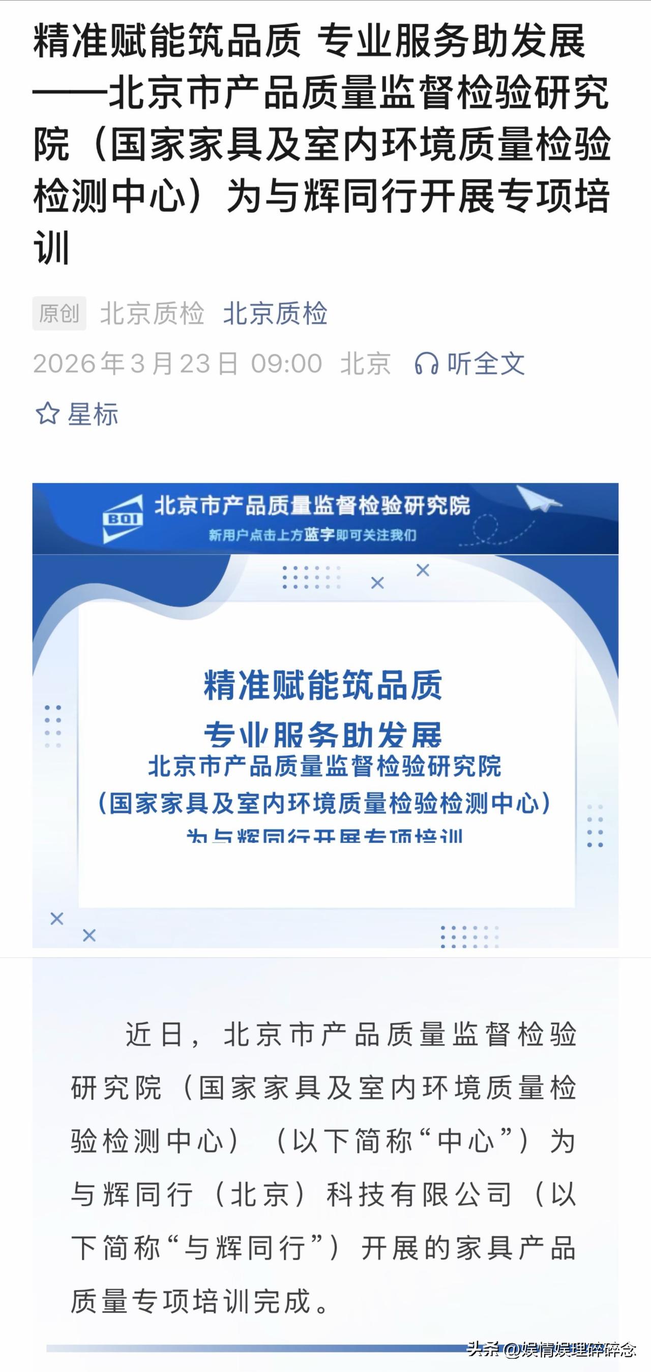 “与辉同行”这一步,走得太扎实了! “北京质检”公众号发文,北京市产品质量监督检验研究院给“与辉同行”做了专项培训,由高级工程师主讲,内容全是关于产品家具质量的干货。 培训方名字很长,但意思很清楚:这是国家级机构,不是随便找的第三方。国家级质检中心,专门为一家直播电商公司开培训课,这在行业里不多见。 以前是经销商为“与辉同行”提供检测报告,发承诺函,现在由国家级质检中心给他们做培训,这一步,是从“别人给标准”到“自己懂标准”的跨越。 从此以后,他们自己的选品体系、品控标准、鉴品能力将稳步提升。当他们把标准越做越细,把要求越提越高,供应链就得跟着升级,同行就得跟着看齐。 路走对了,就不怕远。 董宇辉 与辉同行