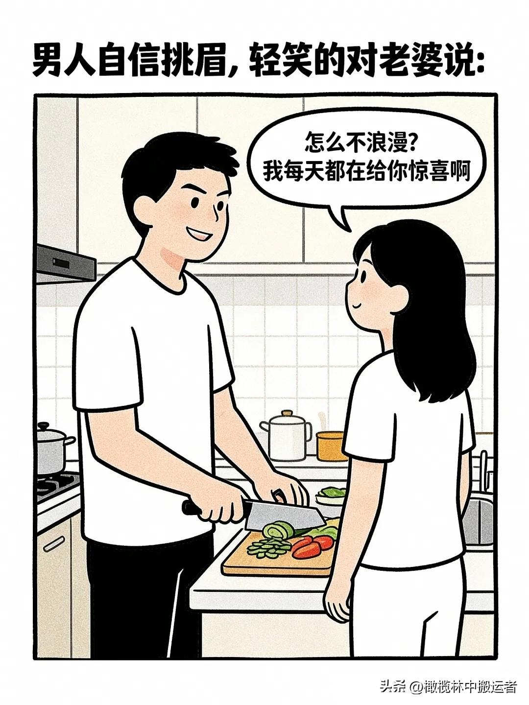 逗笑漫画:老婆抱怨,老公不浪漫。老公:我每天都在给你惊喜啊?老婆:什么惊喜?老公