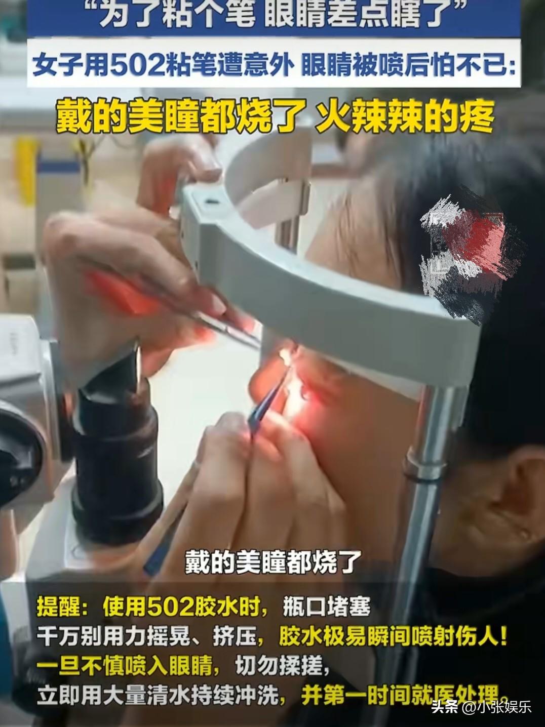 就为粘个笔,眼睛差点废了!502可不能这样用啊! 北京一女士为了给孩子粘支破笔,差点把自己眼睛整“瞎”了, 事情是这样的,这位女士家孩子的笔坏了,她就想着用502胶水粘一下。 可502瓶口被粘住了,她也没多想,使劲晃了好几下瓶子。 结果一打开,502跟下雨似的喷了她一脸,还直接冲进了眼睛里! 当时她戴的美瞳直接被烧了,眼睛也是火辣辣地疼。 她赶紧去医院,医生费了好大劲才把眼睛里的胶水清理干净,这也太可怕了,幸好有美瞳挡了一波,这要是再晚点,眼睛说不定就真出大问题了! 今后在用502的时候,瓶口堵了千万别使劲晃、使劲挤,不然它能一下子喷出来伤人。 要是真不小心弄到眼睛里,千万别揉,赶紧用清水冲,然后立刻上医院,这可不是闹着玩的! 安全无小事,什么东西用的时候都要小心,别一个不小心,就给自己整出大麻烦。!