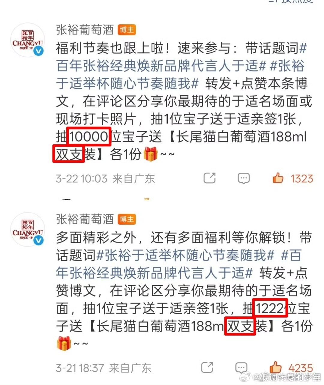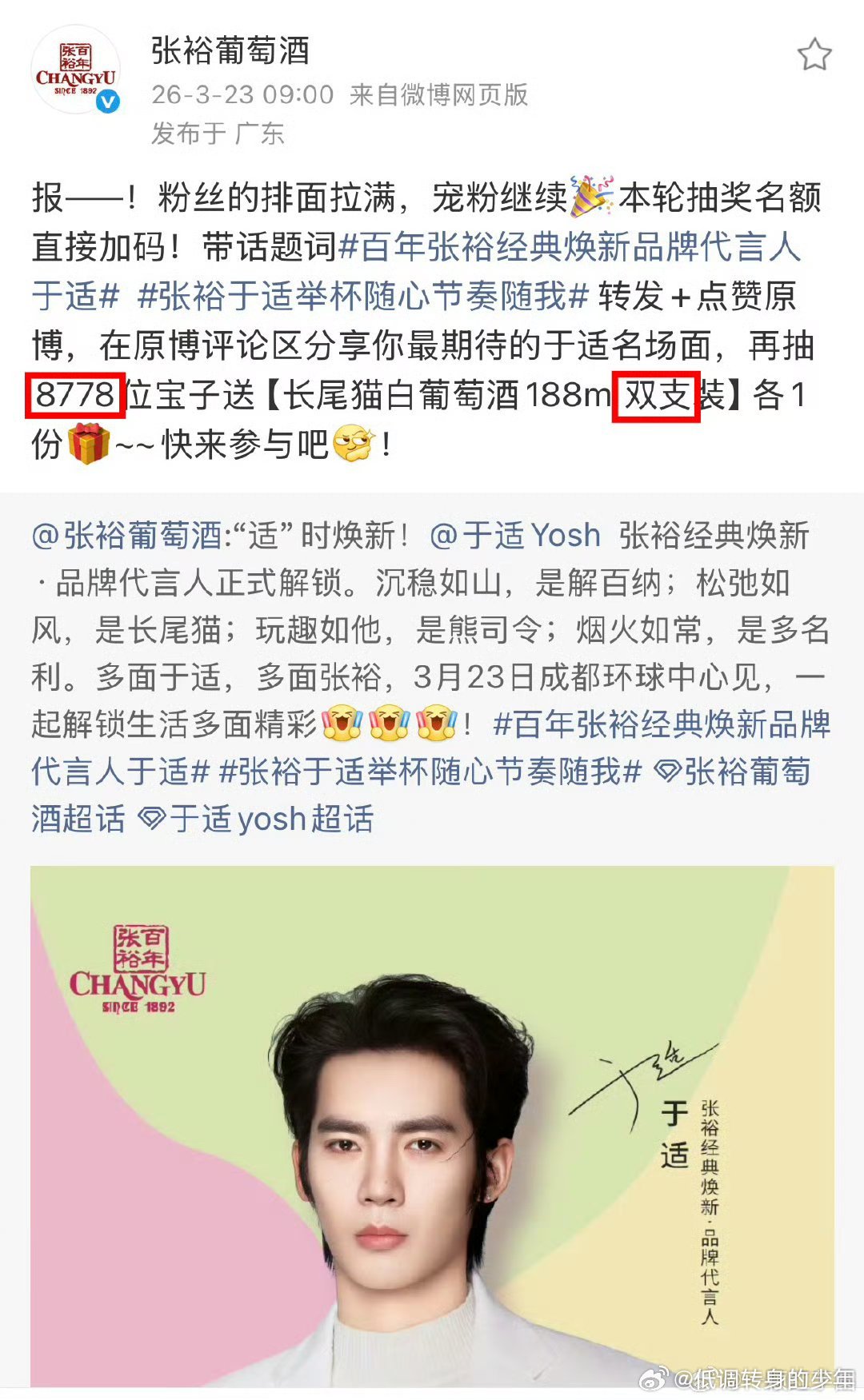张裕葡萄酒官宣全球首位代言人于适,品牌真的太宠了!第一次见直接抽21000个中奖名额的品牌,一共送出42000支酒!于适 这排面足足的