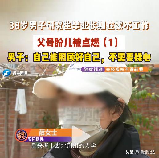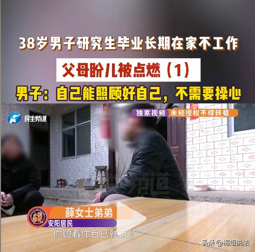 一手好牌打得稀巴烂!河南安阳,38岁的男子高校研究生毕业后不找工作,回家一躺就是十几年,当初8000月薪的工作说辞就辞,在家一年不跟老父亲说一句话。姐姐劝他:以后你老了谁管你?男子直接回怼:就剩我一个人最好,我自己能过好日子! 男子的姐姐找到小莉的时候已经崩溃了,表示自己的弟弟已经倔强到了十头牛都拉不回的境地。 好端端的高材生,当初干着8000块月薪的香饽饽工作,怎么说不干就不干呢?这也就算了,凭着这份高学历,去哪找工作不成,怎么就躺平摆烂浪费大好年华了? 男子当年是研究生,毕业后分配到了一份月薪8000元的工作。 这在当时是收入极高的金饭碗,因为这件事父母高兴地合不拢嘴,觉得儿子给自己争光了,每天对着邻居就是一顿夸。 姐姐也以为弟弟从此平步青云,工作几年再讨个媳妇生个娃,可以安安稳稳地过完一辈子。 没曾想,男子工作4个月后毫无征兆地裸辞回家了。 他回到家,只是一味地把自己锁在房间,不跟家人有过多交流,任凭父母吼骂,姐姐劝诫,他对自己辞职的原因就是闭口不提。 家人为了打开他的心扉,什么招数都用尽了,时间久了越来越拿他没办法。 殊不知,男子辞掉的从来不止是工作,更是打碎了父母一辈子的期望。 两位老人含辛茹苦、省吃俭用地把儿子送进大学,读完研究生,本以为他能找一份体面的工作,过上比农家人更优渥的生活。可到头来,所有的期望都化成了一场空。 如今老父亲70多岁了,身体不算硬朗,每天和儿子怄气,头发早就白完了。 看着老父亲日渐孱弱的身躯,姐姐心疼地不得了,她对这高学历的弟弟是打不得,骂不得,崩溃地只能求助小莉来帮忙。 面对姐姐和小莉的询问,男子一脸不耐烦地说:我自己能管好自己,不用你们瞎操心!我平时也会出去打零工、挣点零钱,生活费够我自己花,你们少管我的事! 姐姐在旁边不停地抹眼泪,又好气又无奈,她直言,父母年纪大了,以后就剩弟弟一个人那可怎么办? 男子佯装镇静地回怼,剩自己一个人才好! 面对小莉的疑惑,男子也没有多说什么,只是表示自己当年辞掉月薪8000元的工作,肯定是有原因的。 一个家庭最怕的不是没钱,而是家人之间相互不沟通有隔阂。男子待在家十几年,整整有1年的时间没有跟父亲说过一句话。 这很明显不是一个正常家庭该有的亲人相处模式。 男子的家人无非是想看到他能有一份养活自己的工作,不至于饿死,以后能有个生活的依靠。 而男子则想的是,自己有手有脚,想做什么都行,不一定非要出去打工,偶尔出去做些零散的活,挣点生活费够吃饭就行。 成年人真的只是挣点养活自己的生活费就行了? 根据《民法典》第一千零六十七条:成年子女不履行赡养义务的,缺乏劳动能力或者生活困难的父母,有要求成年子女给付赡养费的权利。 成年子女对父母有法定的赡养义务,不能以自己没有工作为由,拒绝赡养父母。长期逃避赡养义务,父母有权通过诉讼途径维权。 也就是说,事件中38岁的男子,很明显正值壮年,有能力挣钱养活自己,有能力赡养父母,不能因为自己一时的偷懒,在家躺平,心安理得地不去工作赚钱养家。 最后,在小莉不懈地沟通调解下,男子终于松口说自己不出去打工,是想着过几个月去创业,让家人放心,过几个月后自己的现状就会变得不一样。 至于男子是想要创业做什么,他并没有详说,只是一味地表示自己会有事情做,不会一直躺平不干活。 对于弟弟的回答,姐姐总算松了一口气,不管弟弟将来要干什么,总比躺平无所事事强。 在这件事情中,男子和家人的想法都没有错,只是立场不同,看问题的角度不一样。 男子虽为研究生高学历毕业,也许是因为自己性格内向,不善交际,不喜欢出去跟人打交道,所以选择躲回家里。 而男子的家人则是担心,男子一直这么颓废下去,人生就毁了,将来父母离世了,谁来为他兜底,还不是得靠自己才能活下去。 人生没有后悔药,成年人就应该要对自己的行为和选择负责,担起应有的责任,承担应有的重担。 对于男子的行为,你还有什么想说的吗?