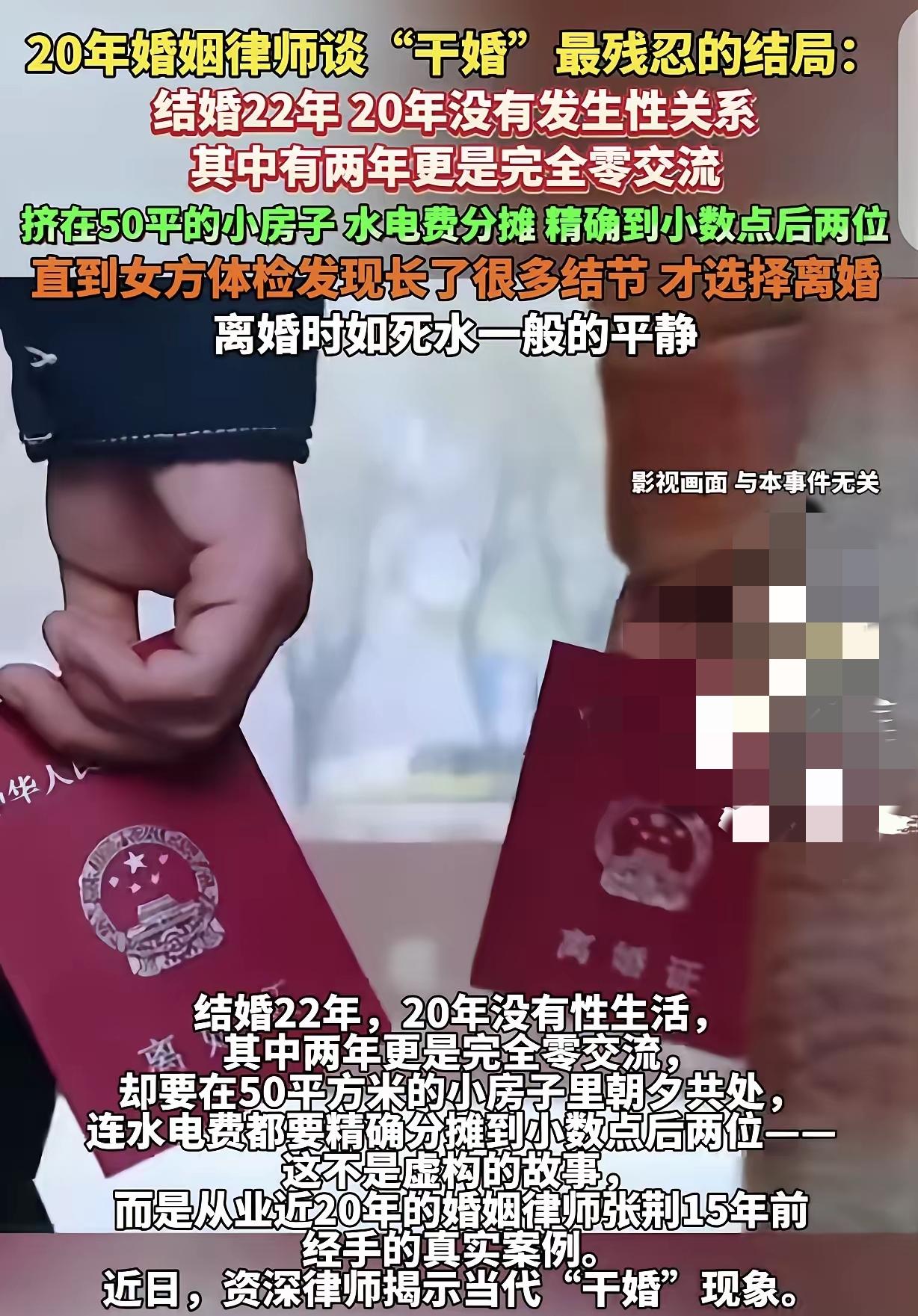 小说都不敢这么写!一对夫妻结婚22年,竟有20年无夫妻生活,挤在50平的小房子里各过各的,连水电费都精确到小数点后两位AA制,直到女子查出一身结节,才彻底清醒离婚。 两人经人介绍结婚,最初也有过平淡甜蜜,可后来感情慢慢冷却,谁都不愿再靠近。同在一个屋檐下,却活成了最熟悉的陌生人,吃饭各管各,日用品分开买,走亲访友也各自准备礼物,互不打扰也互不关心。 旁人劝过离婚,她却怕麻烦、怕非议,将就着过了一年又一年,以为这样能躲开婚姻的争吵,却没料到长期压抑的情绪,直接拖垮了身体。 提出离婚时她异常平静,没有哭闹也没有不舍,这段有名无实的干婚,看似安稳,实则一直在悄悄消耗她。 很多凑合的婚姻都是如此,表面风平浪静,内里早已千疮百孔,冷战和漠视,比争吵更伤人。 你觉得婚姻里,是将就过日子更痛苦,还是及时止损更难?