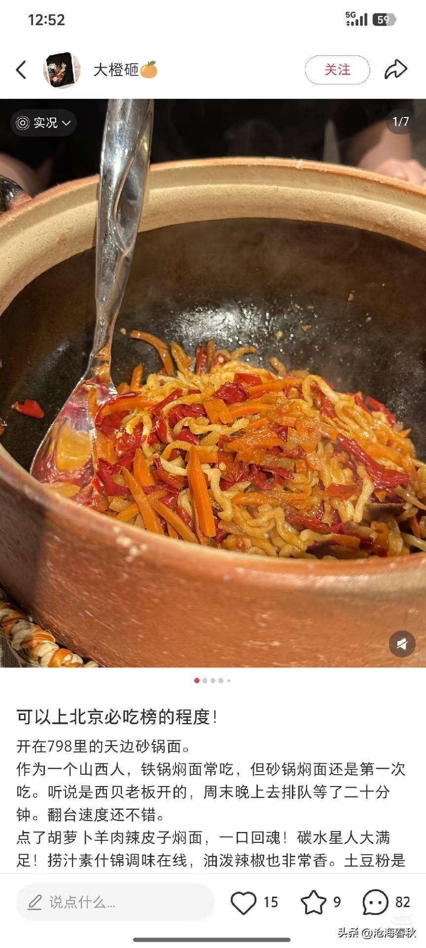 贾老板的天边砂锅焖面惊艳出场 59元一份 大家都去品尝过了吗? 看图应该是加了胡萝卜 绿的好像是豆角 右图红色的是辣椒? 砂锅这么大 面在里面显得只有一点点 有网友说不够她8岁的孩子吃 大概是碳水吃太多不好 分量少一点有益健康 去尝过的说说看 好吃吗?分量够吃吗? 炒肉焖面