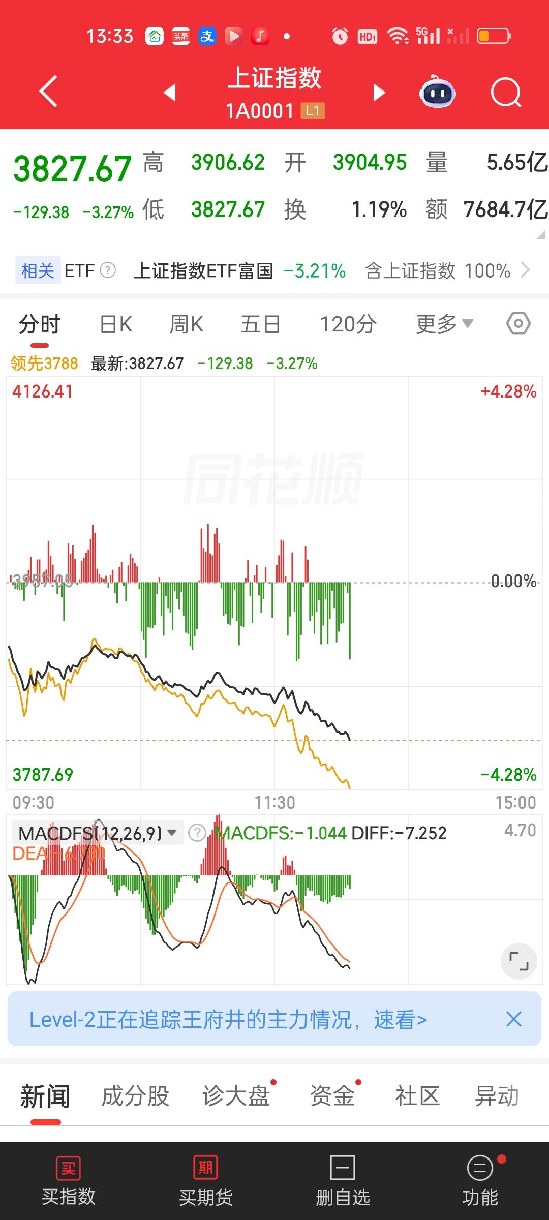 指数杀的差不多了,无限接近3815点和3797点了。跌停家数也达到了53家。这些都已经快到目标位了。但大盘资金净流出的量依旧不理想。成交量中午收盘大幅缩量1200亿,但下午很有可能还会继续放量到1200亿以上。但净流出资金最少也要流出1500亿以上。从某种意义上讲,现在恐慌盘杀出来的量依旧不够。那怎么样才能把恐慌盘继续逼出来呢?只能加大摇车的力度,继续疯狂摇车了!
