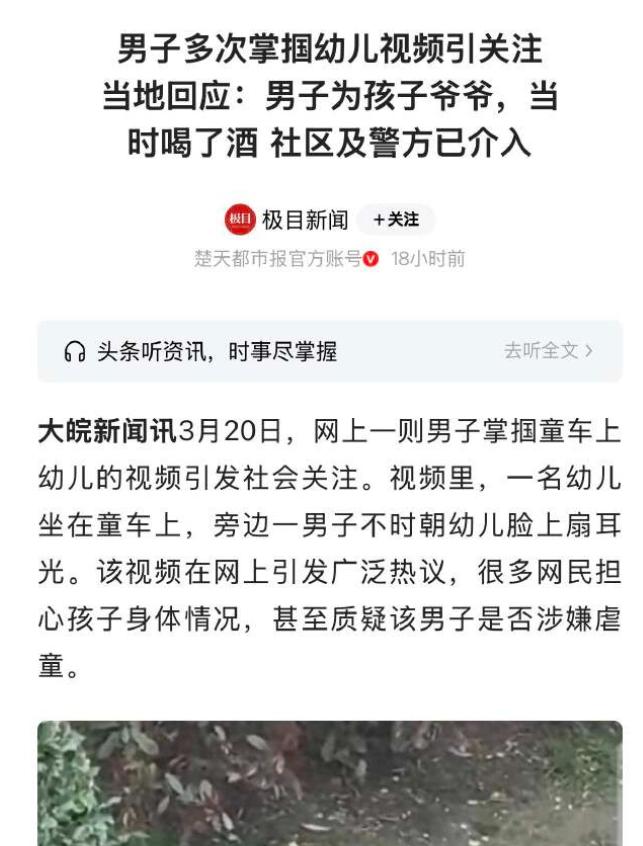 河南郑州,一男子推着婴儿车在一小区里休息,趁着四下无人,男子竟掌掴婴儿,推车里的幼儿被男子一会打左脸,一会打右脸,孩子被男子打的哇哇大哭。后来有路人看见了,悄悄将这一幕记录了下来,但是尚未有人敢上去跟这位男子理论。实在不清楚这位男子打婴儿的意欲何为。 今年3月20日深夜,郑州嵩山路街道一处小区里,一辆婴儿车停在绿化带边,一个老人站在旁边。 四周安静,路上没什么人。 就是在这样的空当里,他弯腰,抬手,朝车里的孩子连续打了下去。 孩子那么小,连躲都不会躲。视频里虽然听不真切,可光看脑袋被打得来回偏摆,就知道那不是轻轻拍两下,也不是什么大人口中的“吓唬吓唬”。那是实实在在落在婴儿脸上的力道。 更扎心的地方在后头。 他停手,不是因为突然心软了,也不是因为酒醒了,而是因为旁边有人经过。 这个细节几乎把所有辩解都堵死了。人要是真糊涂到失去判断,就不会分辨有没有旁人,更不会知道要挑没人的时候动手。 拍下视频的人没有立刻冲上去,这件事同样让不少人别扭。 可把自己放进那个现场,也许很多人才会承认:人有时会被眼前一幕钉住,脑子先空一拍,手先去掏手机留证据,脚却没跟上。 你说这是勇气不够也好,是怕惹祸上身也罢,它都指向一个很现实的问题——家庭里的暴力,哪怕发生在公共空间,旁人往往也容易迟疑。 好在这次,视频没有沉下去。 从深夜开始,画面在网上迅速扩散。有人认出小区位置,直接联系街道,也报了警。到3月21日凌晨4点左右,相关人员已经赶到现场,社区和警方都介入了,先看孩子安不安全,再查动手的人是谁。 进展很快,施暴者身份很快核实:孩子的亲爷爷。 这层关系一出来,很多人的第一反应不是愤怒,反倒是难受。陌生人打孩子,大家会骂“禽兽”。自家爷爷打亲孙子,骂完之后,还会多出一种说不出的沉闷。 因为这意味着,孩子原本最该依赖的人,恰恰成了伤害他的那只手。 家属后来的说法也很典型。孩子母亲说,老人平时一直帮着照看小孩,对孩子并不差。那晚是喝了酒,情绪出了问题。 检查之后,孩子暂时没发现明显外伤。孩子父亲人在外地,得知消息后,希望先不要立案,等自己回去再商量。 如果只看法律,这并不难判断。成年人连续掌掴婴幼儿,本身就已经越线。哪怕表面只有红肿,没有达到严重伤情,也可能面临治安处罚。 如果伤到耳膜或造成更深层损害,责任还会往刑事方向走。至于“喝多了”,从来不是挡箭牌。酒精不会替人承担责任,它只会把一个人的闸门冲开。 可要是只看家庭,很多人的第一念头又会变成另一套算法:老人一直在帮忙带孩子,儿子在外工作,真立案了,老人留下记录,这个家以后怎么处?孩子谁照看?关系怎么收拾?说白了,父亲那句“先别立案”,未必是认同暴力,更像是现实把人逼进了夹缝里。 问题也恰恰出在这里。 当一个家庭不得不依赖老人帮带时,照护责任和权力边界常常是模糊的。爷爷奶奶不是法定监护人,却在日常生活里握着最直接的照看权。 孩子吃什么、什么时候睡、几乎都在他们手里。一旦其中有人失控,孩子往往连求助都做不到,外人也很难第一时间察觉。 很多家庭总爱用一句话来安慰自己:他平时挺好的。可这句话,有时不是解释,反而是危险信号。 因为真正让人害怕的,未必是那个天天把恶意挂在脸上的人,反而是那个大多数时候看着正常、偶尔在某个瞬间突然把怒气砸向最弱者的人。 还有一种错觉也得尽快打掉:没看出明显伤,不等于没受伤。 婴幼儿的皮肤、骨骼、耳部都比成人脆弱,头部被打到那样晃动,风险绝不只是脸上红没红。更别说心理上的惊吓,往往没有检测单,却可能在很长时间里缠着孩子。 一个连话都说不完整的小孩,根本讲不出“我害怕”,可身体会记住,睡眠会记住,神经会记住。 这当然不是说老人帮带天然有问题。现实里,无数老人替子女扛起了养育压力,辛苦是真辛苦,付出也是真付出。 可帮忙带孩子,从来不等于拥有发泄情绪的资格。带娃再累,委屈再多,都不能把一个不会反抗的婴儿变成出气口。 这一点,没得商量。 而那个最让人过不去的细节,我们还是得再说一遍——他是看见有人路过,才停手的。 这说明,他知道那几下不能见人。 既然如此,社会就更该把目光伸进去,把那些“没人看见”的角落再照亮一点。 孩子越小,越需要外部世界替他说话。 信息来源:极目新闻——男子多次掌掴幼儿视频引关注当地回应:男子为孩子爷爷,当时喝了酒社区及警方已介入