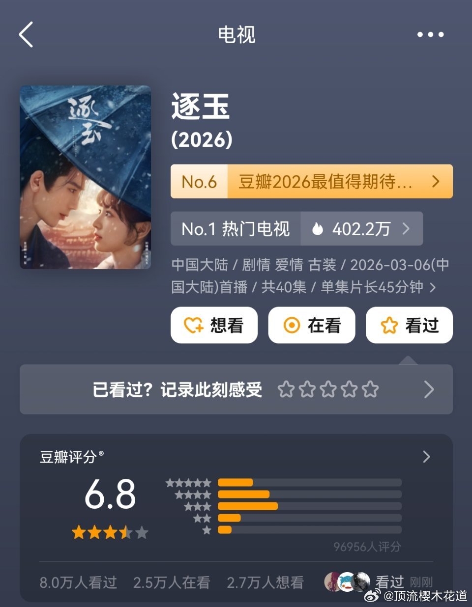 逐玉豆瓣评分6.8分,上午8.7万人评分,下午曾至96956人评分,打分人数有些