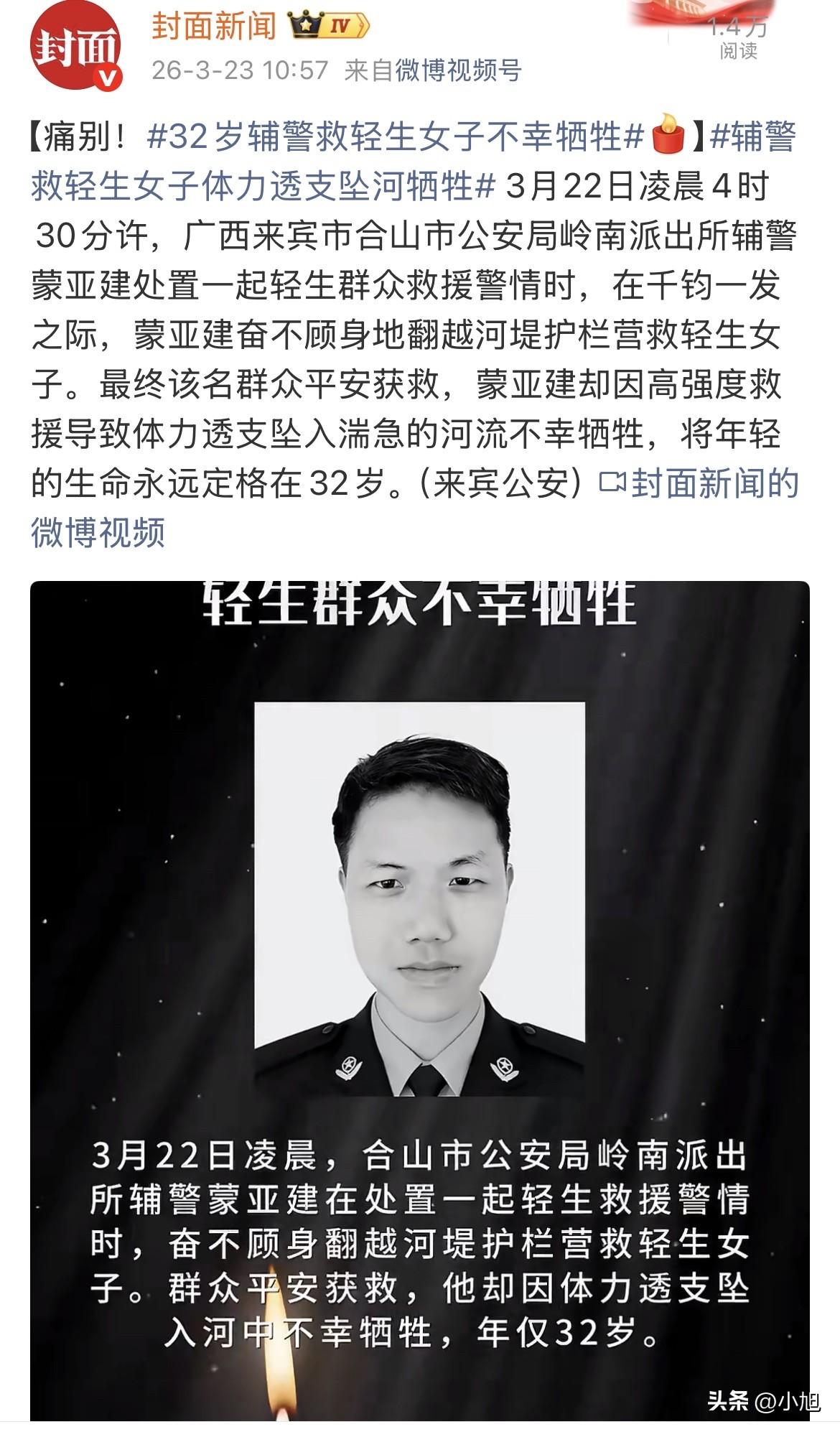 凌晨四点半,这个时间点,大多数人还在睡梦中。广西合山市的一条河边,32岁的辅警蒙亚建,接到报警出了警。 现场的情况很急。一名女子双手抓着护栏,整个身体已经悬在河堤外面,脚底下就是湍急的河水。稍有一点闪失,人就没了。 蒙亚建和两个同事赶到的时候,一个同事先抓住了那个女子的手腕。这个时候,蒙亚建跟另一个同事直接翻过了河堤的护栏。 河堤边上的地方很窄,刚下过雨还湿滑。他一只手死死攥住护栏,把自己固定住,身体半蹲着,另一只手拼命去拽那个女子。 就是这么一个很别扭、很难受的姿势,他跟同事一起,硬是把那个女子从护栏外面推回到了安全的地方。 人救回来了。 就在女子脱险的那一瞬间,蒙亚建因为力气用完了,身体一歪,没稳住,直接掉进了河里。 他是1994年出生的,今年才32岁。2023年5月才参加公安工作,做辅警还不到两年。 据说,当时他翻越护栏去拽人的时候,其实那个位置非常危险。他是把固定自己身体的那只手,和救人的那只手,配合到了极限。一边要稳住自己不掉下去,一边还要把人往上推。 他把所有的力气都用在往外推人的那一下了。人上去了,他的力气也彻底耗尽了。 有人可能会问,值不值?但当时那种情况,哪里有时间想值不值。看见有人要掉下去了,伸手去拽,是本能。穿着那身制服,往前冲,是本能。 我们经常说“警察”是平安的守护者,但很多时候,辅警兄弟也冲在最前面。他们拿的工资可能不高,干的活儿却一点都不少。到了这种生死关头,他们没想过自己是“辅”警,他们想的是,我是警。 一条命换回了另一条命。 32岁,正是家里顶梁柱的年纪。他是合山本地人,家就在岭南镇。他的家里人,凌晨四点半接到电话赶到现场,等来的却是这样一个结果,这种痛,我们外人没法体会。 现在,获救的那个人平安了。可是蒙亚建,却永远停在了这个春天的凌晨。