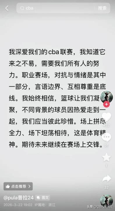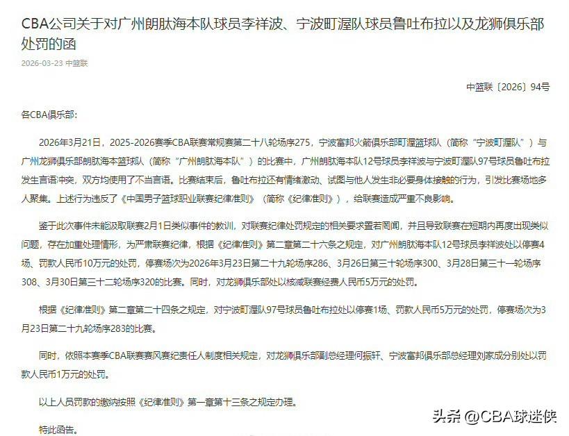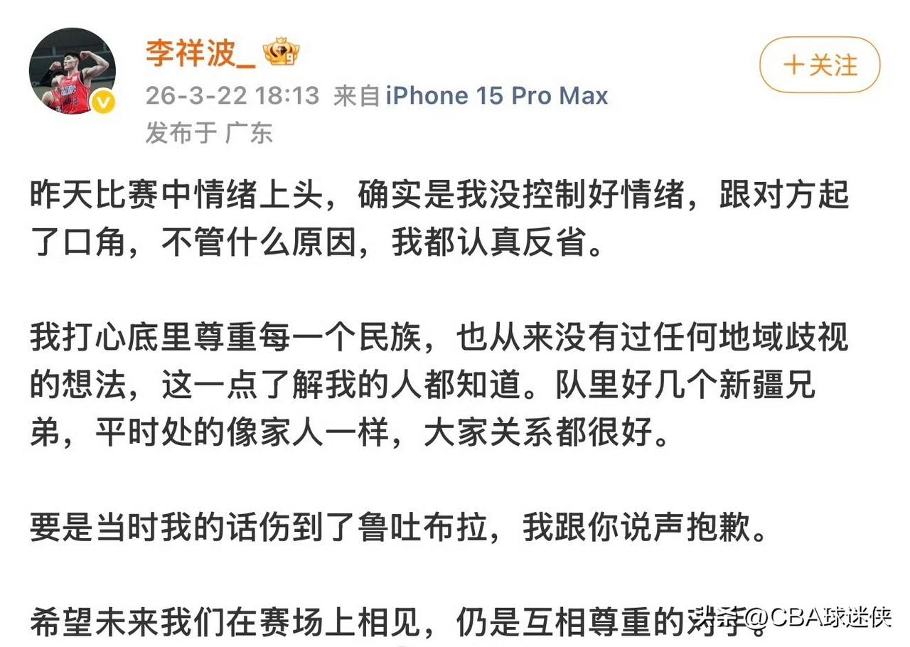罚单来了!李祥波“打馕”言论停赛4场罚10万,鲁吐布拉怒砸消防器材停1场 CBA官方终于出手了。 ① 李祥波:停赛4场+罚10万 3月21日宁波vs广州赛后握手环节,李祥波对鲁吐布拉说出“回家打馕”等不当言论,直接引爆冲突。官方认定其“未能汲取2月类似事件的教训”,从重处罚——停赛4场,罚款10万元。广州俱乐部也被核减联赛经费5万元。 ② 鲁吐布拉:停赛1场+罚5万 被激怒的鲁吐布拉当场暴走,被劝离后余怒未消,一拳砸向球员通道消防栓,玻璃碎裂,手部受伤被救护车送医。官方认定其“情绪激动、试图与他人发生非必要身体接触”,停赛1场、罚款5万。 ③ 赵睿前车之鉴,这次罚更重 2月份赵睿因“回去打馕吧”被禁赛3场、罚5万。仅仅一个月后,李祥波当面再说类似言论,处罚直接升级——多停1场,多罚5万。 ④ 刘家成硬刚到底 宁波总经理刘家成赛后直接冲到广州教练面前要说法,随后社媒发声:“56个民族是一家,任何侮辱性、地域性的语言都不应该出现在赛场。” 李祥波事后道歉:“队里好几个新疆兄弟,平时处得像家人一样。”但评论区已经不买账了——赵睿刚罚完,你又来?