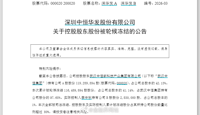 【深华发A,“五连板”后惊现“天地板”】 3月23日,曾斩获五连板的深华发A开盘涨停后不足3分钟上演高台跳水,盘中触及跌停,上演天地板走势,截至发稿仍围绕跌停价震荡。此前一周该股连续五个交易日涨停,区间涨幅61.01%位列A股涨幅榜第二。公司多次公告提示主营业务经营正常,内部环境未发生重大变化。上周四晚披露控股股东武汉中恒集团约1.16亿股被轮候冻结,实控人李中秋所持283万股B股全被司法冻结,累计冻结股份占其所持超80%。其业务涵盖工业制造和物业租赁,液晶显示器为支柱(2025上半年营收占比超80%)。2025前三季度营收6.83亿元同比增12.65%,归母净利润0.21亿元同比增49.31%。详情:深华发A,“五连板”后惊现“天地板”