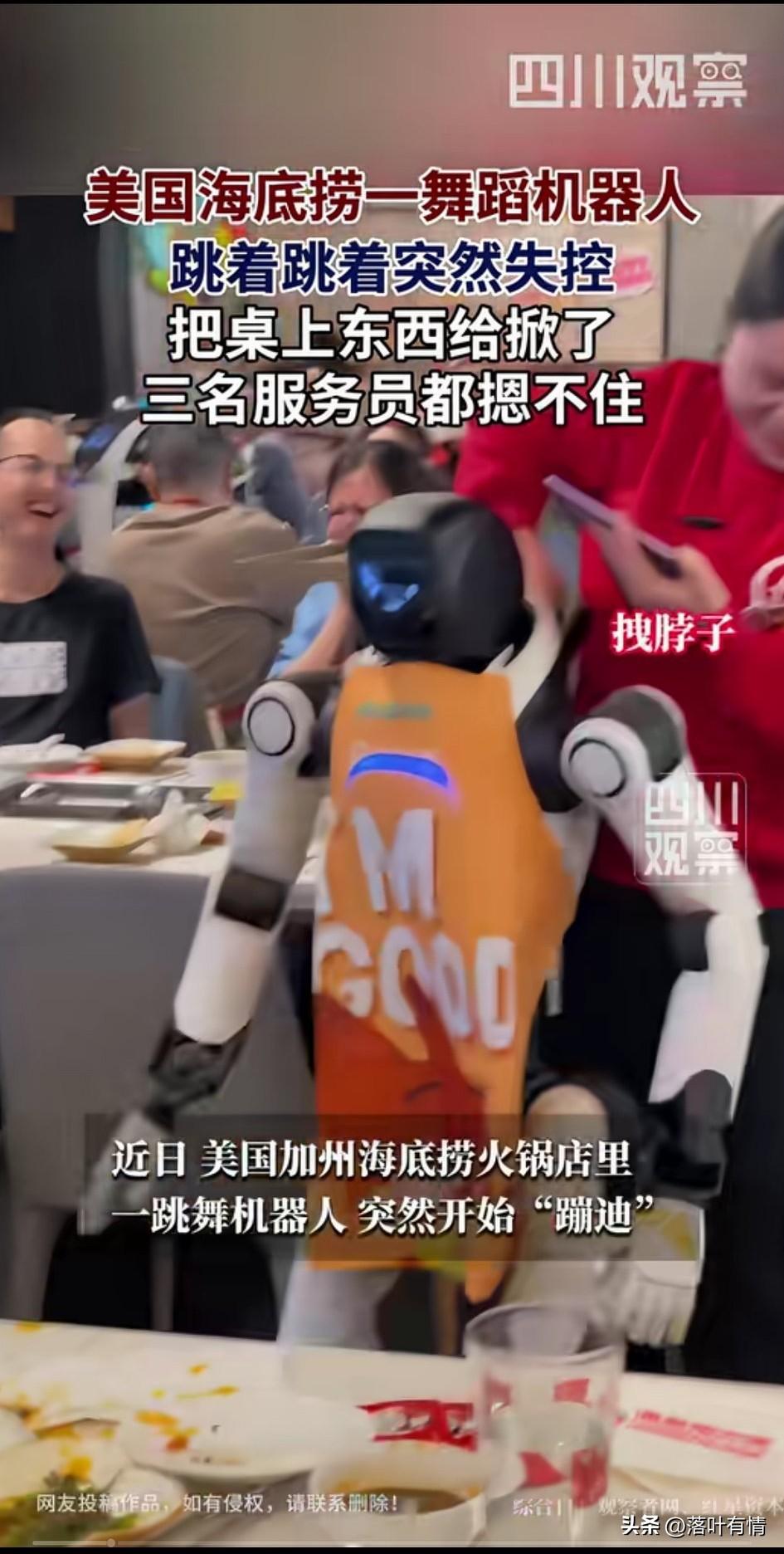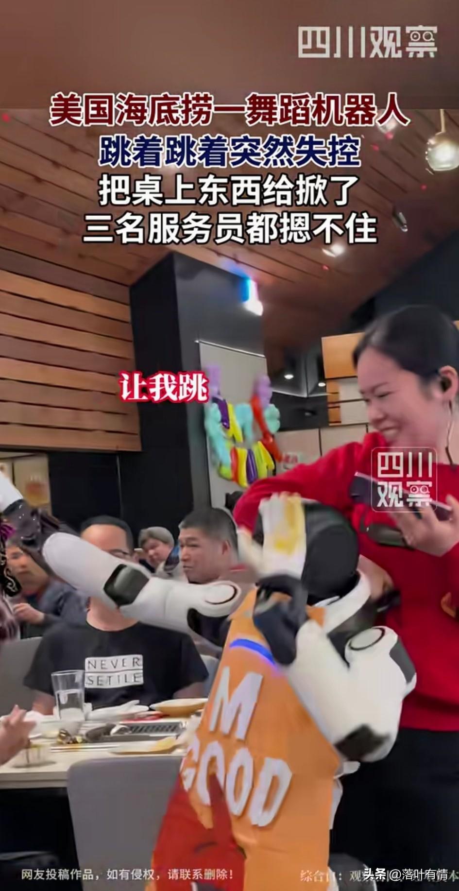美国一海底捞的机器人, 工作期间表演舞蹈, 跳着跳着直接失控, 直接把桌子差点掀了, 工作人员发现之后, 立刻上前制止, 结果三个人都按不住机器人, 音乐不停,舞蹈不止, 直接把现场的人都逗笑了, 本来引进机器人跳舞, 就想着机器人不会累, 结果没想到机器人也扛不住了, 这样的场面实在太逗了, 其实实际上也是需要休息的, 要是长时间工作, 机器也是会扛不住的, 更不要说是人了, 大家觉得未来机器人是不是会应用到各个领域? 海底捞 机器人吃火锅