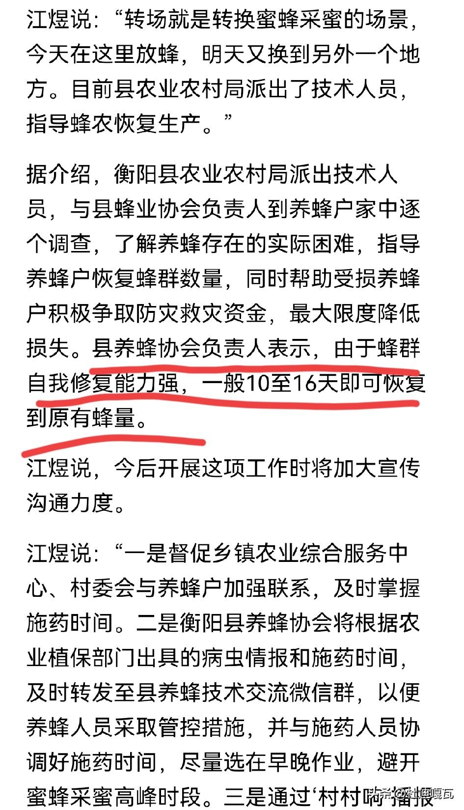 油菜花打药致大量蜜蜂死亡后续,专家出来辟谣,根本没有想象的那么严重。 近日,江西,湖南等地的油菜花打药导致大量蜜蜂死亡,其中有农户就透露自己的几十箱蜂受损,损失可能达到几万元。 但衡阳县农业农村局与县蜂业协会人员到养蜂户家中逐个调查,认为情况并没有想象的那么严重, 而且县养蜂协会负责人表示,蜂群拥有自我修复能力,一般10至16天即可恢复到原有蜂量,这也会使得蜂农的损失会降到最低。 看到这儿大家也就放心了,毕竟还是很同情养蜂人,1/3的蜜蜂死去损失是暂时的,十天半个月就可以恢复了,也算是好消息吧!