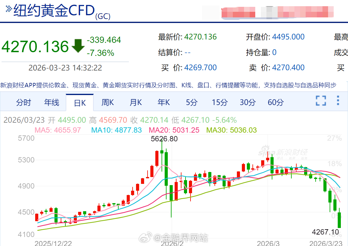 【国际金价意外崩了!中东战争以来已暴跌19%,国内金价跌破1000元关口,通胀预期、美联储议息、美元指数成“三大杀手”】 3月23日金价大跌,国内黄金主力期货合约跌8.5%至940元/克(美伊开战以来累计跌17%);伦敦现货黄金跌5%(累计19%)、纽约黄金跌超6%(累计18%);国内头部品牌足金饰品报价跌至1363-1397元/克,较3月中旬跌超150元/克(跌幅超10%)。下跌原因:市场主线切换(从避险到通胀与货币政策博弈)、美联储货币政策转向超预期、美元指数走强。机构分歧:看多者认为长期支撑逻辑未变,回调是配置机会;看空者认为美联储未明确降息前难有趋势上涨,需跟踪货币政策、地缘局势、央行购金节奏。详情:网页链接