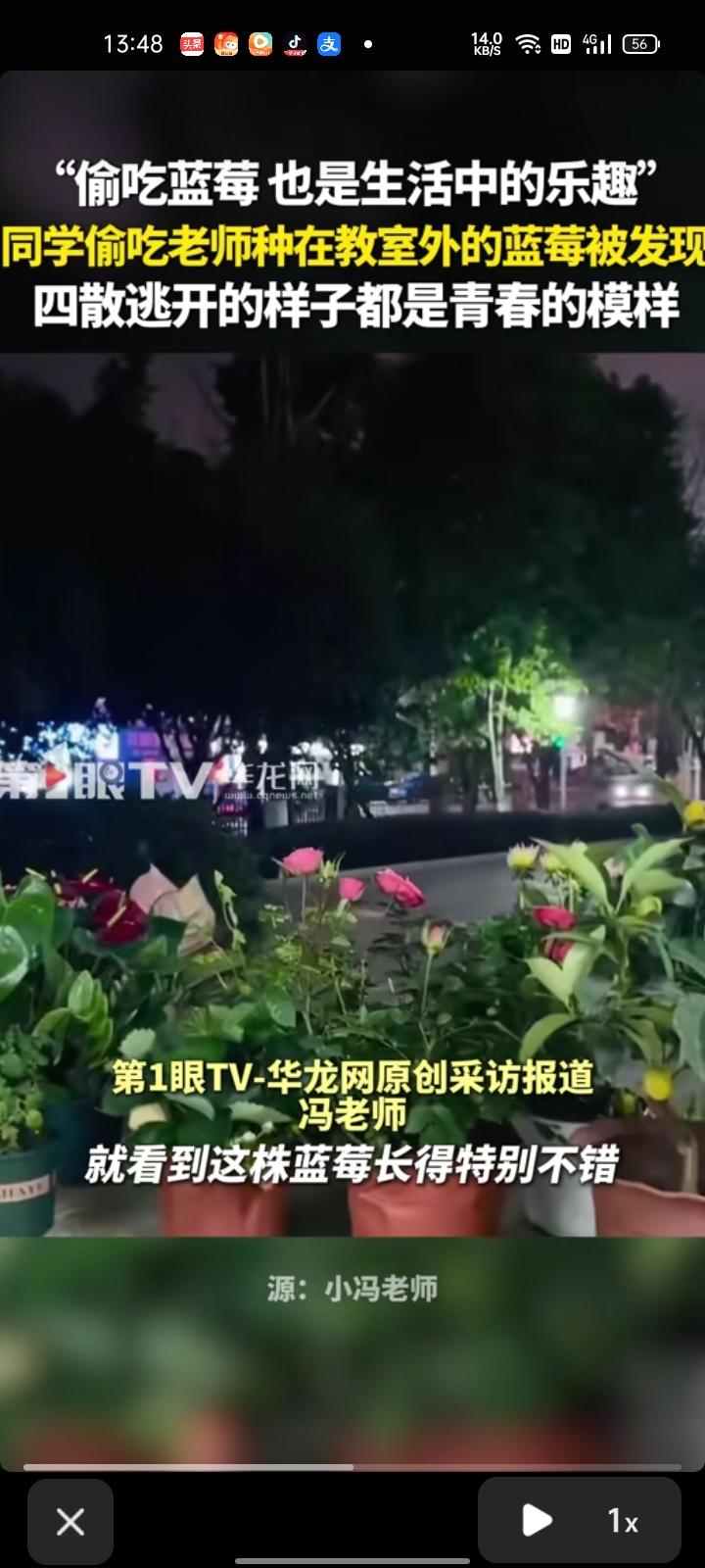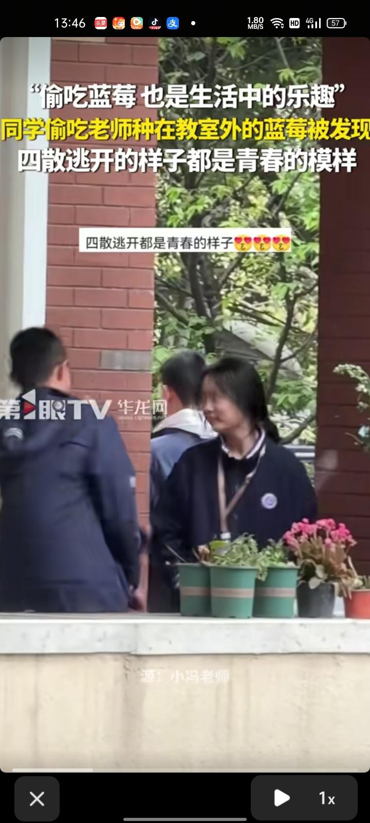 3月21日,重庆。学生们偷吃种在教室外的蓝莓被老师发现,四散逃开的样子都是青春的模样。 冯老师介绍,平时生活中都会买一些花花草草,有时会买一些水果。这次刚好在花市里看到这株蓝莓长得不错,想着把它放在教室门口,开玩笑的写了一个标签“禁止采摘”,没想到孩子们对这个特别感兴趣,其实他们偷吃蓝莓的事情让她感到开心和幸福。