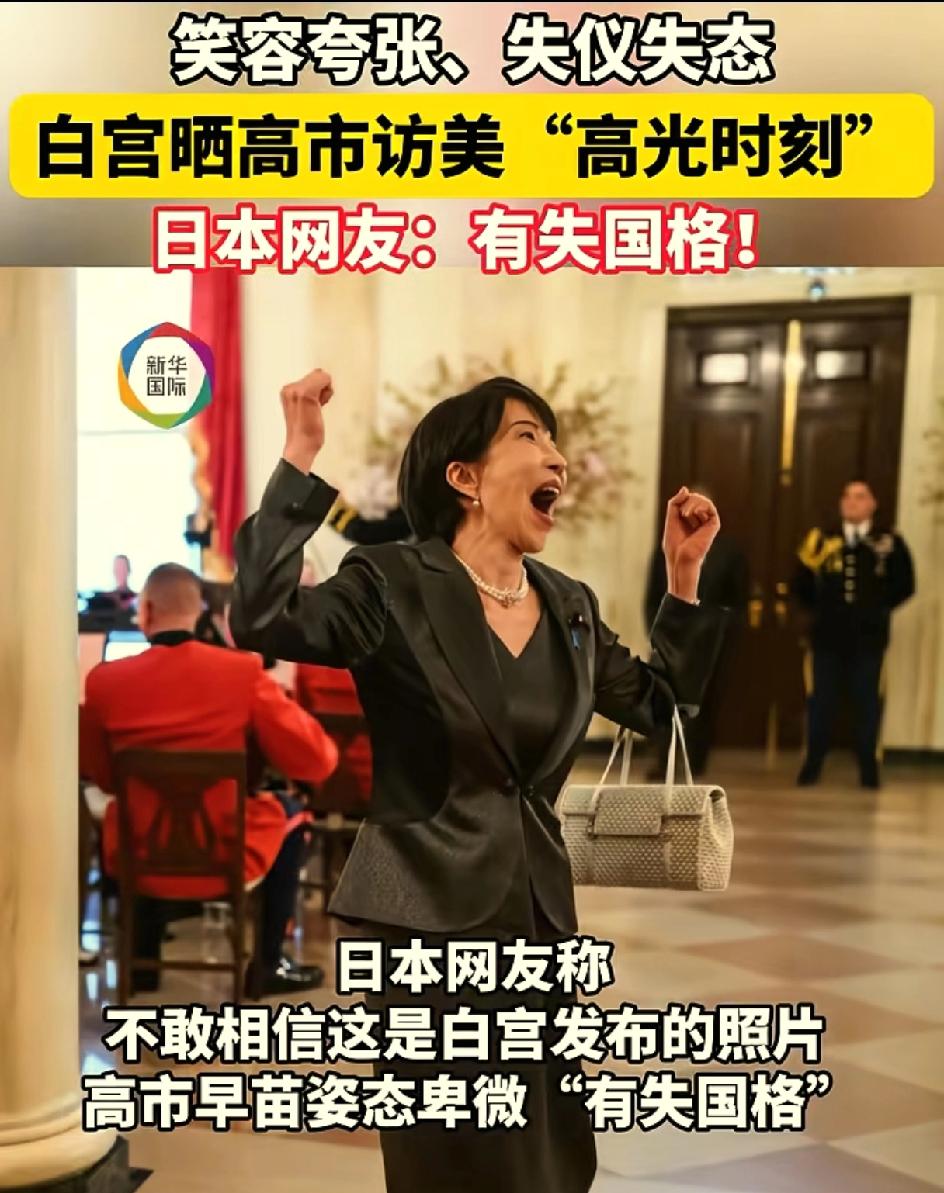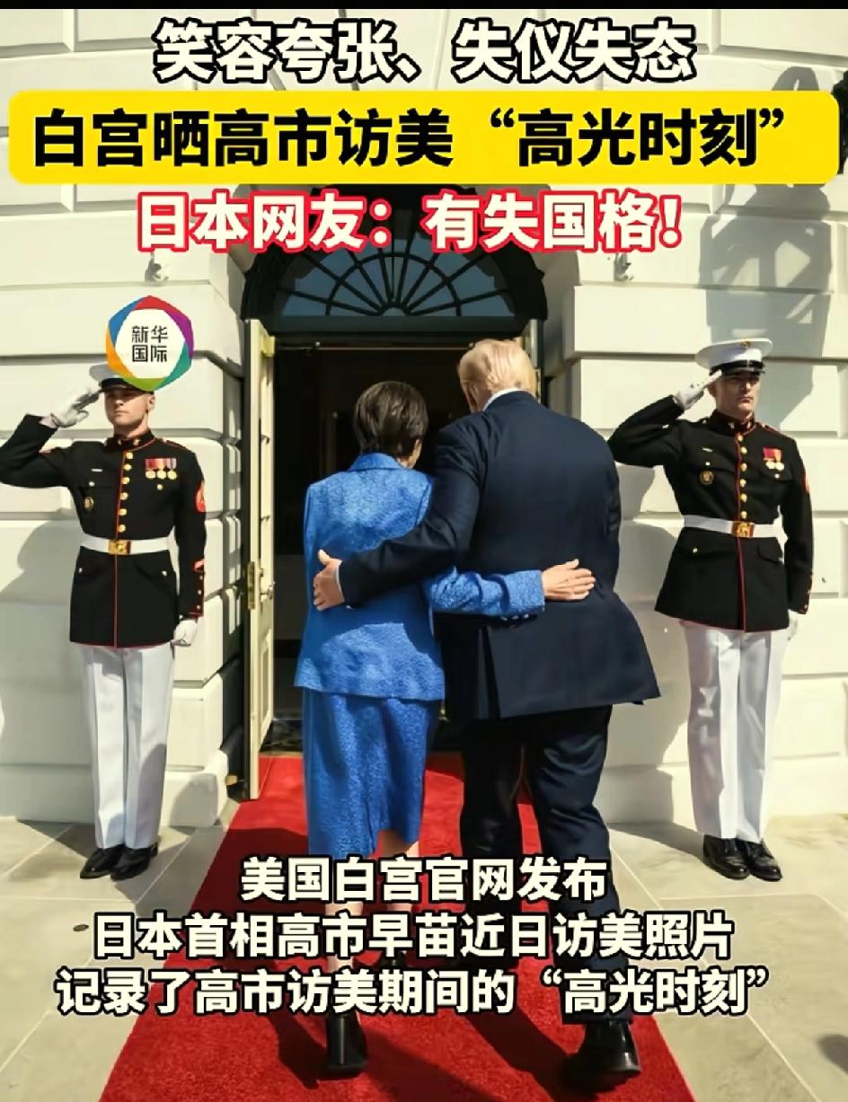 高市早苗与特朗普拥抱,牵手,抚摸其手背。特朗普演讲的时候,她瞪着大眼睛摇头晃脑,在那里一顿夸赞。还借此机会给特朗普的儿子巴伦送生日祝福,说他儿子又高又帅,基因像谁呢?肯定像他爸爸呀。早苗带着一串珍珠项链,特朗普一眼瞥见了想起了珍珠港事件。高市早苗把谄媚,卑躬屈膝,演绎的淋漓尽致。