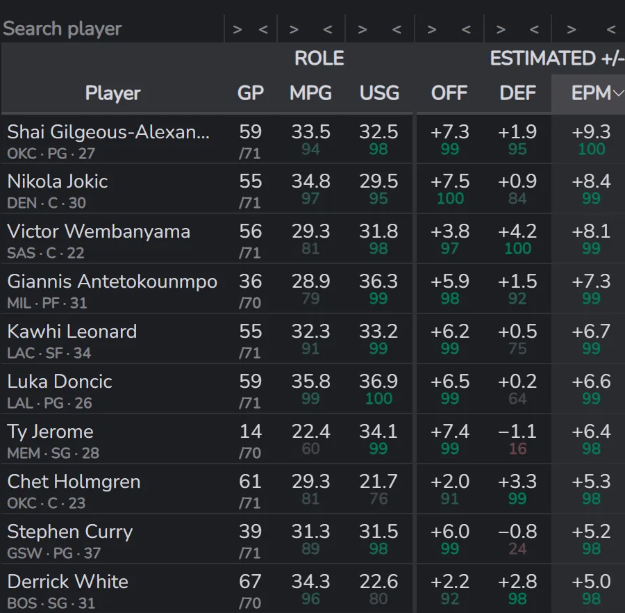 关于MVP之争与文班的最新各项高阶数据 首先,明确的说,本赛季的MVP 99%概率是亚历山大,他也完全实至名归。 支持文班是MVP与判断本赛季谁是MVP是两回事,前者是立场情感和主观判断,后者是事实判断。 我做梦都希望文班拿MVP,但本赛季MVP基本已经是亚历山大囊中之物,这个是客观现实。忽略包括MVP榜,赔率,中期模拟投票等论据,硬说文班能拿MVP,感觉除了招黑没其他作用。 然后,讨论一下MVP的标准。 众所周知,MVP的标准就是没有标准。 MVP作为一个媒体奖项,他的评选标准从来不一,战绩,数据,故事性,审美,近因效应都会产生影响。 具体到本赛季。 首先是战绩,这个雷霆目前还是联盟第一,而且由于剩余场次较少,狗刺本赛季逆转拿到赛季第一的可能性比较小。 然后就是重点来了,数据。 文班主要是吃亏在基础数据,其实就是得分低了。虽然现在基础数据不太重要,但得分这一项在观感上影响还是挺大,我认为这个也是东契奇这次榜单能超过文班的原因。连续高分带来的观感提升是诸如高阶数据无法带来的。 然后更新一波现在的高阶数据。 首先是两个现代高阶数据,EPM和LEBRON 文班EPM目前联盟第三。