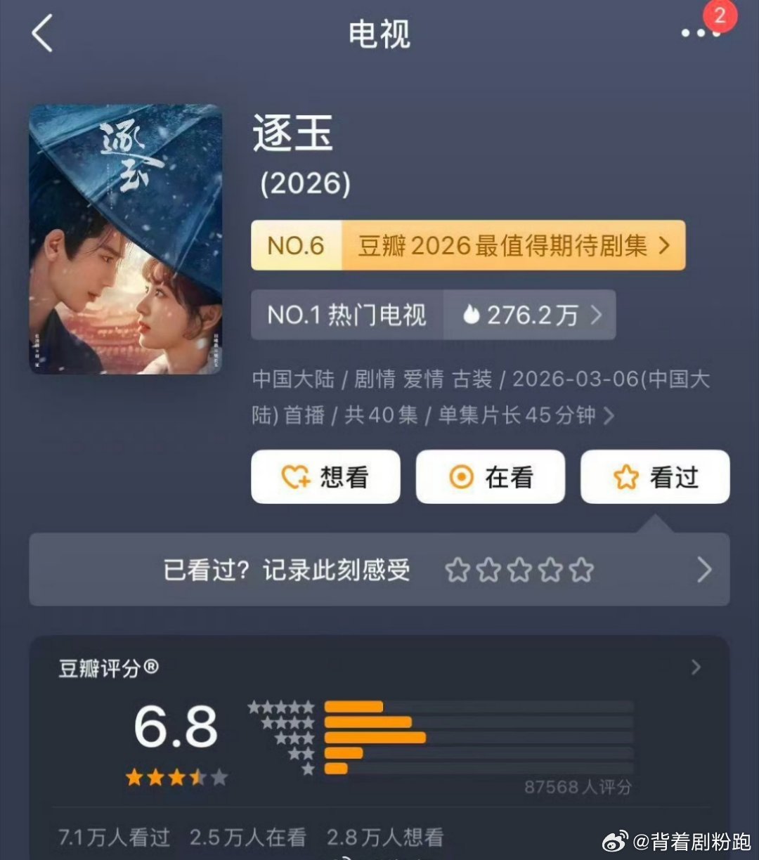 张凌赫田曦薇《逐玉》6.8分梅婷、田雨、陈昊宇《好好的时光》6.9分谭松韵《我的山与海》6.6分