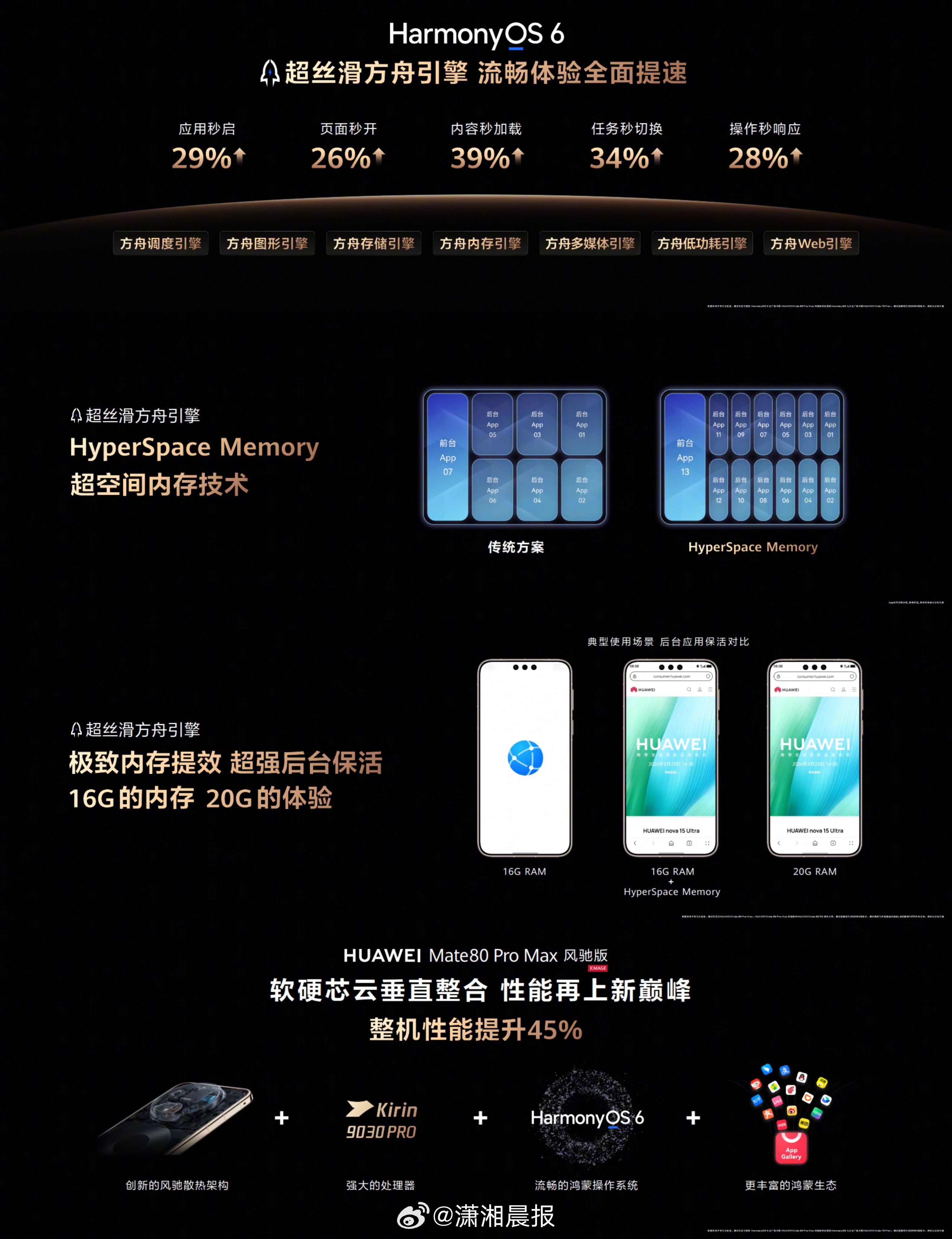 #华为Mate80风驰版正式发布# 今日,华为Mate 80 Pro Max 风驰版重磅面市,对高端旗舰性能进行了深度探索。业界首创的超导热弯流翅片搭配仿生羽翼涡扇与隐藏式无感出风设计,共同构成了华为风驰散热架构,大幅提升了内部换热效率,借此让整机性能大幅提升。同时,新机底层的硬化内存算法带来了等效16G内存20G体验的惊人效果,彻底打破系统运行瓶颈。物理风扇的降温能力与超大内存空间的完美结合,让用户在面对高强度办公与娱乐时也能游刃有余。#Mate80风驰版内存黑科技#