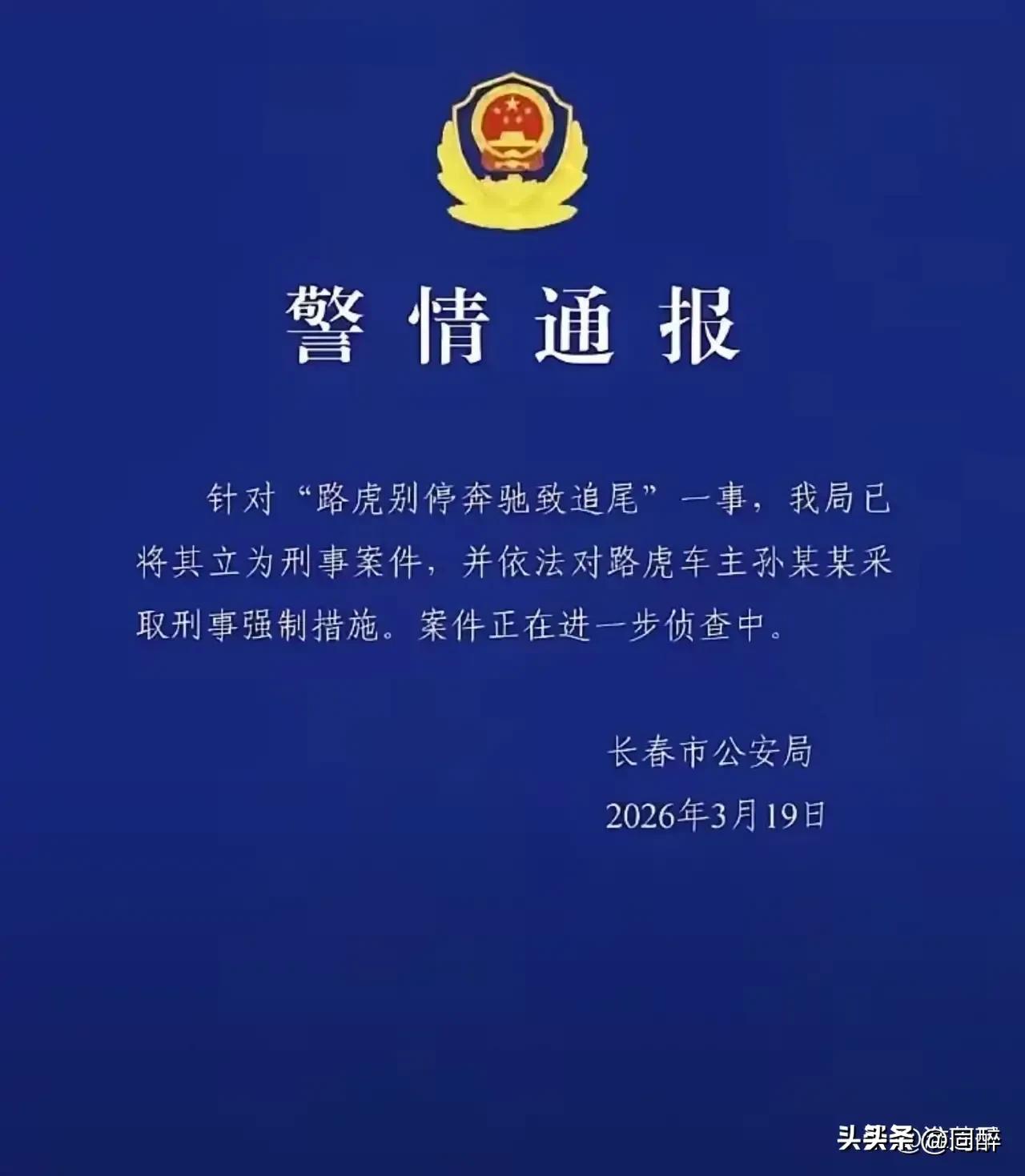 关于路虎车司机故意别奔驰司机一事,其本质就是权力的较量,双方实力相当,就看哪一方更厉害!更具实力! 一凡较量后,路虎明显更胜一筹! 本来是一件普通的因路怒症引发的交通纠纷,之所以最终演变成全社会关注的事件,则是因为隐蔽的权力在其后推波助澜、兴风作浪。 2025年12月10日长春发生路虎短时间内8次恶意别奔驰,致追尾事件,经过多次认定反转后,3月19日长春市公安局正式刑事立案,对路虎车主孙某某采取刑事强制措施,案件进入进一步侦查阶段,奔驰车主近16万元损失理赔问题待解。 案件经认定过程: 第一阶段,派出所先以行政案件受理,后来不知何因,又突然以“犯罪事实显著轻微”为理出具《不予立案通告书》。 第二阶段,案件转交警处理,2026年2月3日朝阳区分局以“无违法事实”终止调查。 第三阶段,3月3月,长春市公安局法制支队刑事复议,认定原决定“事实不请,证据不足”,撤销并责令重新调查。 第四阶段,3月19日,长春市公安局通报,案件立为刑事案件,对路虎车主孙某某采取刑事强制措施。 无论孙某某是何人物,也不论其身后有何种过硬的关系,最终都将为自己的张狂付出代价,毕竟终究我们是法制社会,王子犯法与庶民同罪!