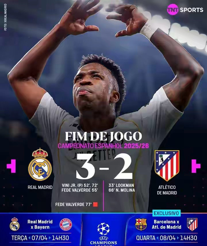 • 比赛亮点:全场共打入5粒进球,节奏紧凑、对抗激烈,远超外界预期。皇马在先丢球的情况下完成逆转,展现出极强的韧性与豪门底蕴。马竞虽拼至最后一刻,但仍未能守住胜果,遗憾落败。