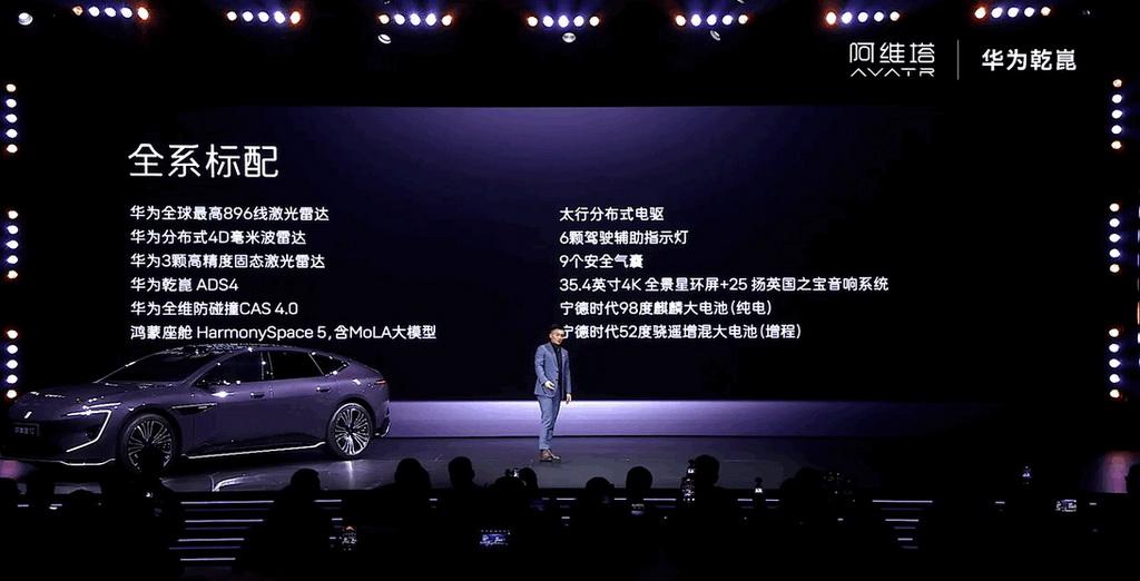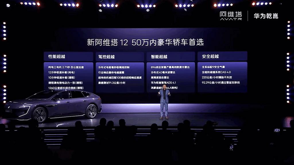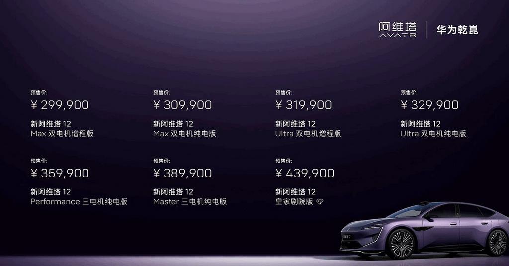 【预售价29.99万起,新款阿维塔12将于4月8日上市】日前,新款阿维塔12开启预售,共推出七款车型,预售价区间为29.99-43.99万元,预售期间2000元意向金抵扣5000元大定定金,将于4月8日正式上市。新车定位中大型轿车,轴距为3020mm,全系标配华为乾崑ADS 4.0高阶智驾系统与鸿蒙座舱HarmonySpace 5,搭载包含896线激光雷达在内的32个传感器。内饰采用环抱式设计,标配35.4英寸4K全景星环屏及25扬英国之宝音响。动力表现上,新车提供增程与纯电三种方案。增程版采用1.5T增程器配后置双电机,WLTC纯电续航261公里;纯电版提供双电机后驱及三电机四驱可选,其中三电机版系统最大功率达712千瓦,零百加速为2.71秒。此外,纯电版标配98度麒麟电池,增程版标配52度骁遥增混电池,全系均配备太行分布式电驱系统。【来自懂车帝车友圈】
