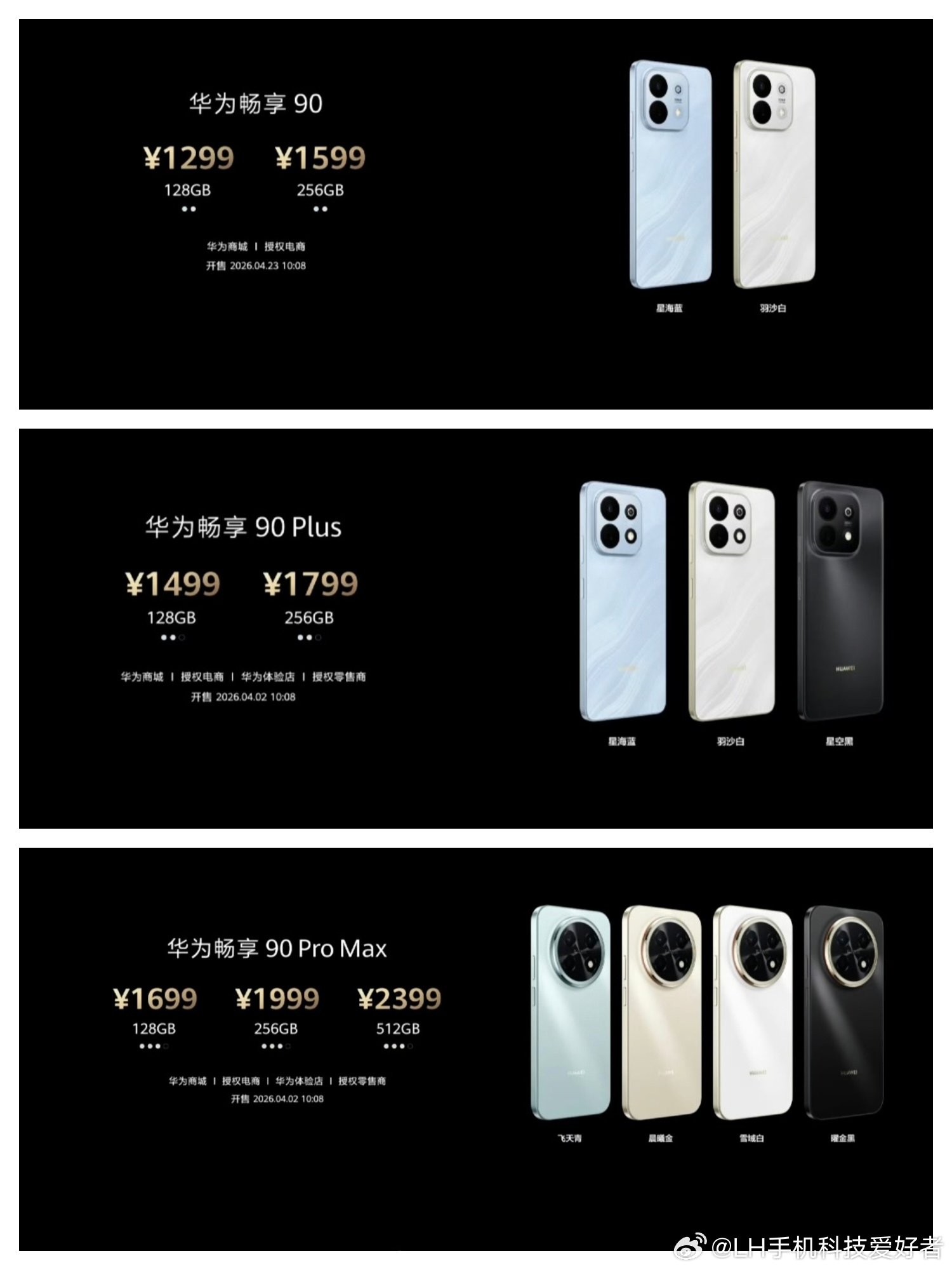 华为畅享90售价1299元起;华为畅享90 Plus售价1499元起;华为畅享9