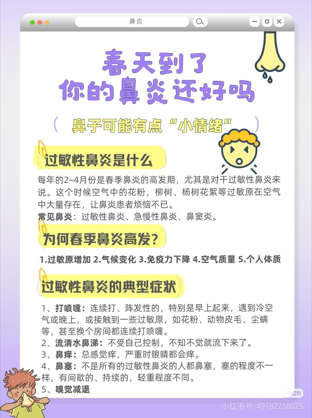 一到春天我的鼻子就这样一到春天鼻子就开始闹脾气,打喷嚏流鼻涕真的太难受了。不过现在大家越来越重视鼻炎护理,也有很多温和的缓解方法,好好防护、规律作息,春天也能舒服不少,希望每个被鼻炎困扰的人都能轻松点。