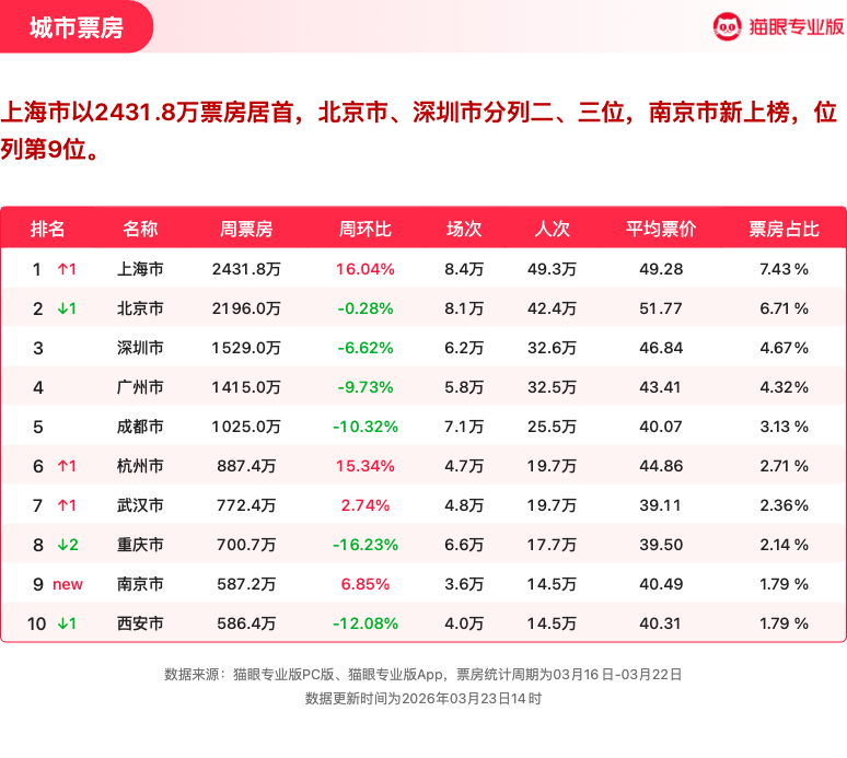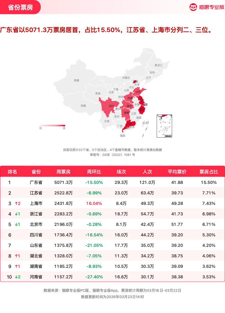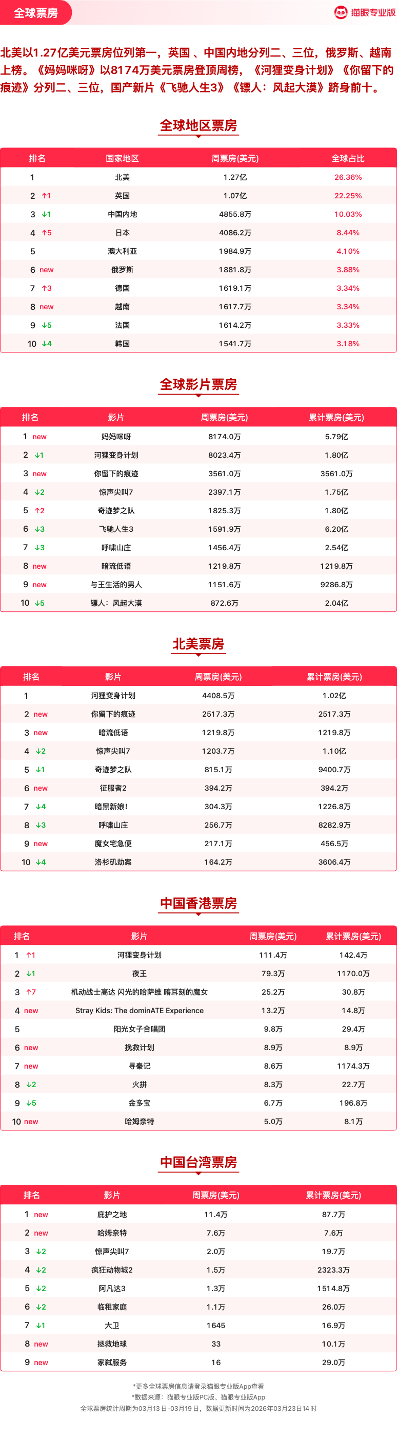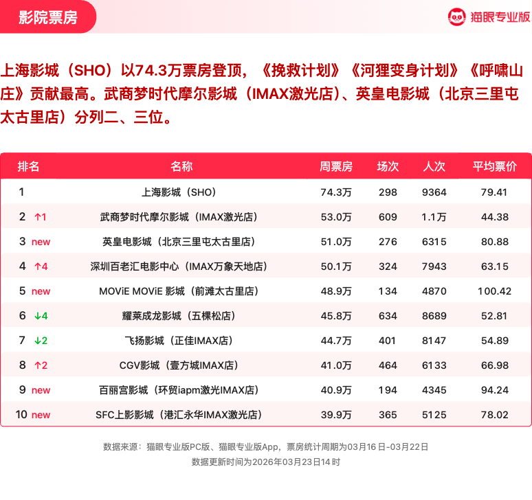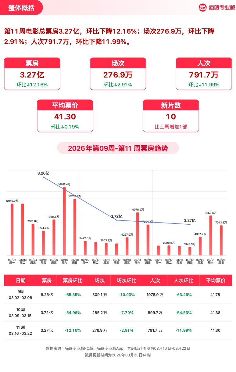 飞驰人生3连续5周获票房周冠 猫眼专业版2026年第11周电影周报发布📒:周