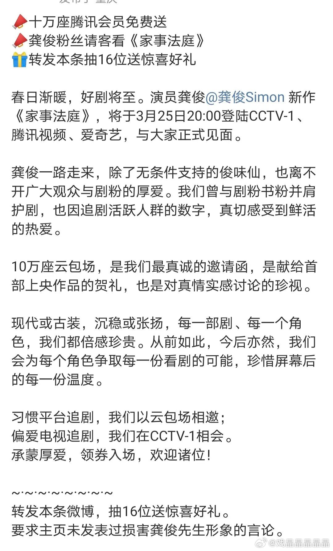 龚俊粉丝在鹅赠送十万云包场,邀请大家看《家事法庭》。