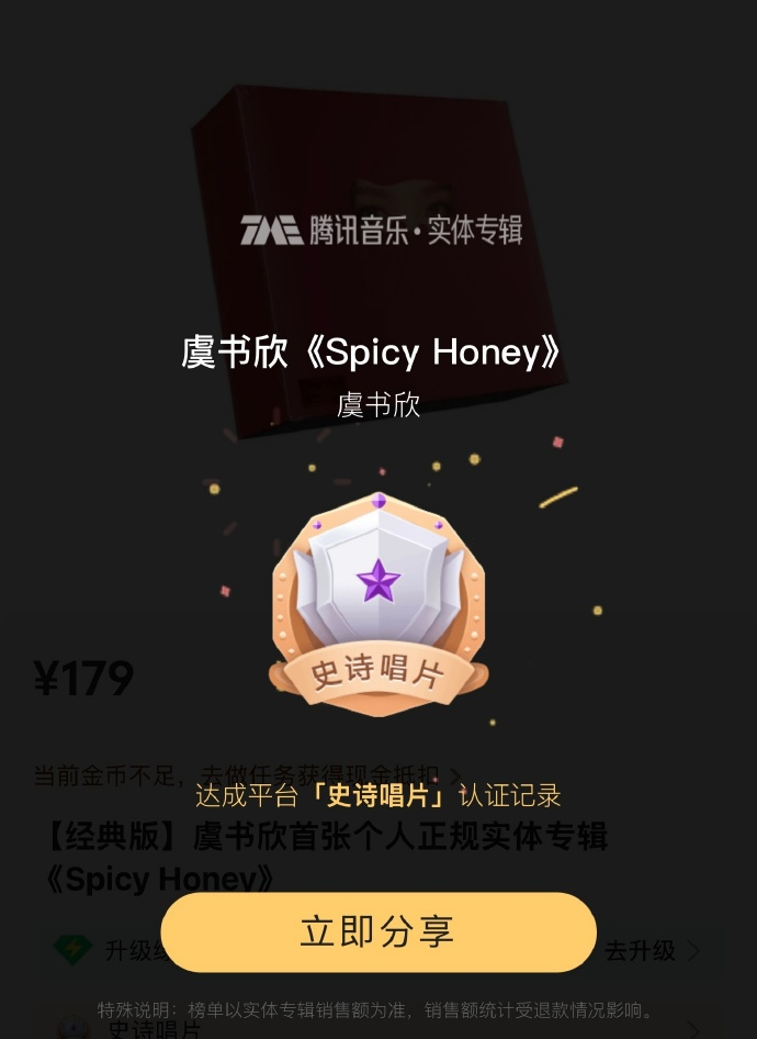 虞书欣首张实体专解锁了【史诗唱片】荣誉!有3000万+销售额。虞书欣是唯一解锁史诗唱片(含以上)荣誉的女星, Q音实体专辑总榜唯一破史诗女歌手。好牛啊!而且虞书欣也将在4月进行线下签售会!期待欣欣子!