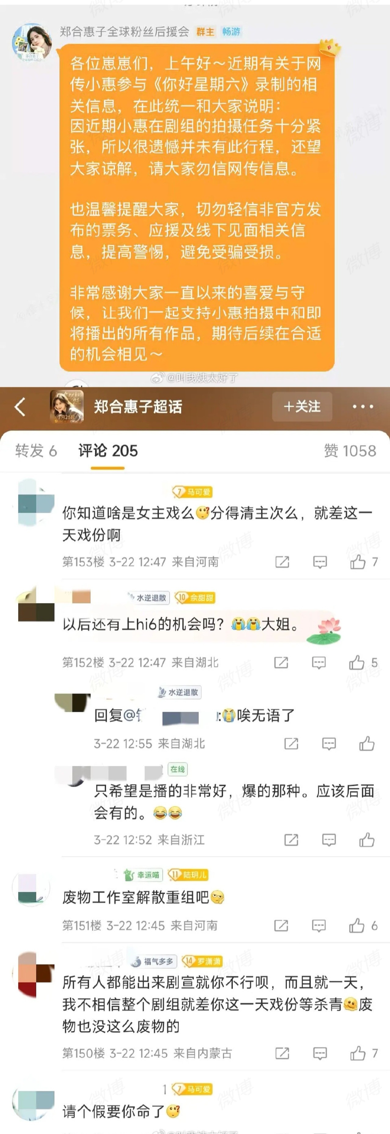 郑和惠子因为在拍《将门毒后》放弃去hi6女主剧剧宣,仅剩男主魏哲鸣单人宣传,粉丝开冲工作室,理由是团队未能提前统筹档期,导致主演缺席关键宣发窗口,错失提升剧集热度与个人曝光的机会。尤其《你是迟来的欢喜》是其近年稀缺的女主资源郑合惠子回应称此为"多方协调后的遗憾"而非"放弃"