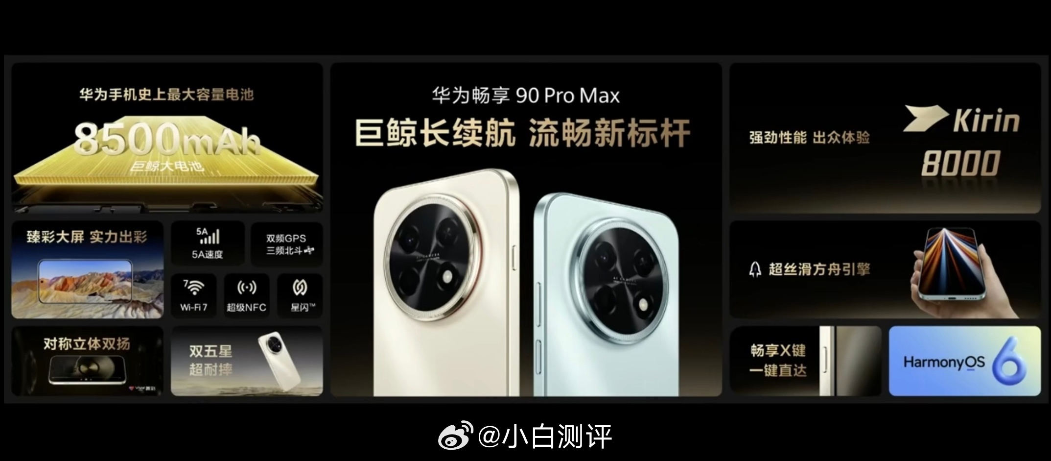 华为畅享90系列发布,全系搭载麒麟8000系列👇🏻 - 华为畅享90 Pro Max,华为史上最大电池8500mAh:128GB版1699元,256GB版1999元,512GB版2399元; - 华为畅享90 Plus:128GB版1499元,256GB版1799元; - 华为畅享90:128GB版1299元,256GB版1599元;