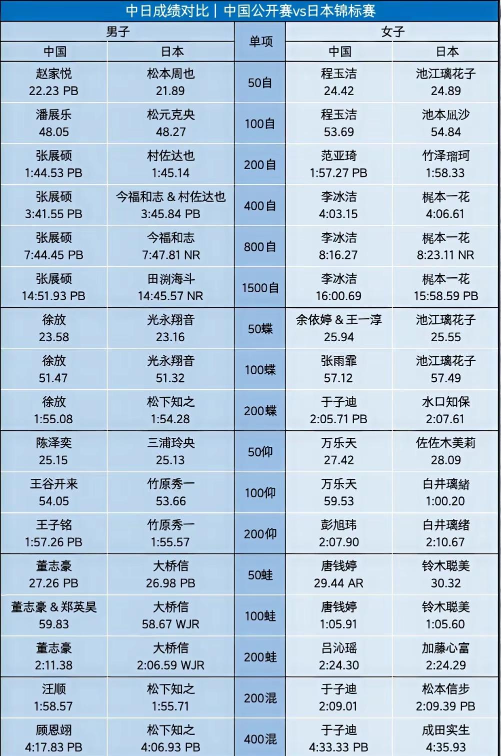 18:16!这就是中国公开赛和日本全锦赛两国最新游泳实力对比,日本男子13:4领先中国男子,中国女子14:3领先日本女子。 在五个男子泳姿中,以张展硕和潘展乐为首的中国男子自由泳是唯一领先日本的组别,其他四个泳姿仰泳、蝶泳、蛙泳、混合泳的中国冠军都明显落后于日本全锦赛冠军的成绩,没有覃海洋和徐嘉余的参赛,中国男子游泳实力掉了一大截,不过即使两人参赛,总体实力上仍然略逊于日本男队。 女子方面,中国女运动员与男子的萎靡不振形成了鲜明对比。在五个个人泳姿上,中国运动员以14:3占据绝对优势,除了李冰洁的1500米自由泳、唐钱婷的100米蛙泳和吕沁遥的200米蛙泳略输于对手之外,中国冠军其他14个单项成绩都大幅度超过日本女将,其顶尖高手的质量和数量也比对手更胜一筹。 总体来说,中国与日本两国游泳实力呈6:4开,日本男队略占上风,而中国女队显示出压倒性优势。谁才是亚洲泳坛第一强国?这个问号只能等到6个月后的名古屋亚运会上才能见分晓了。
