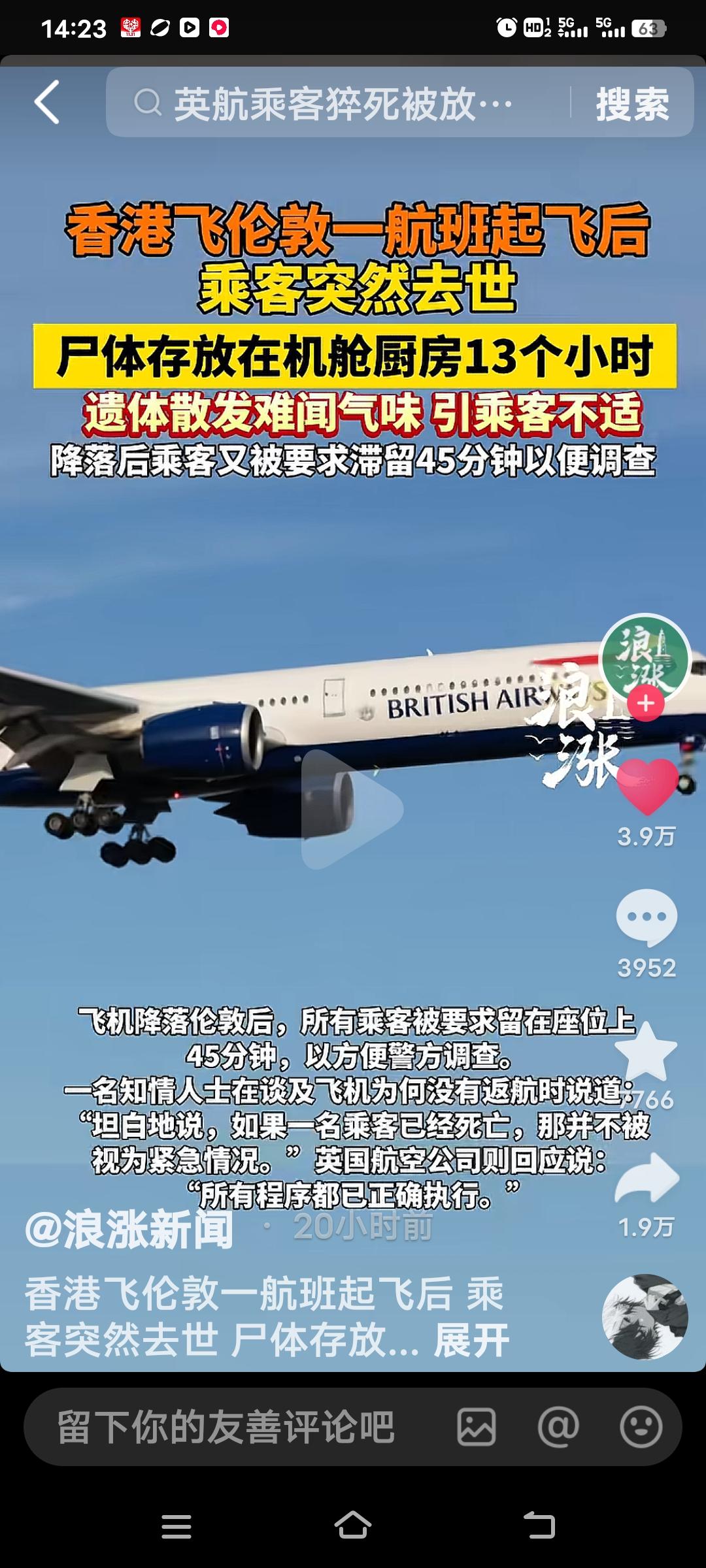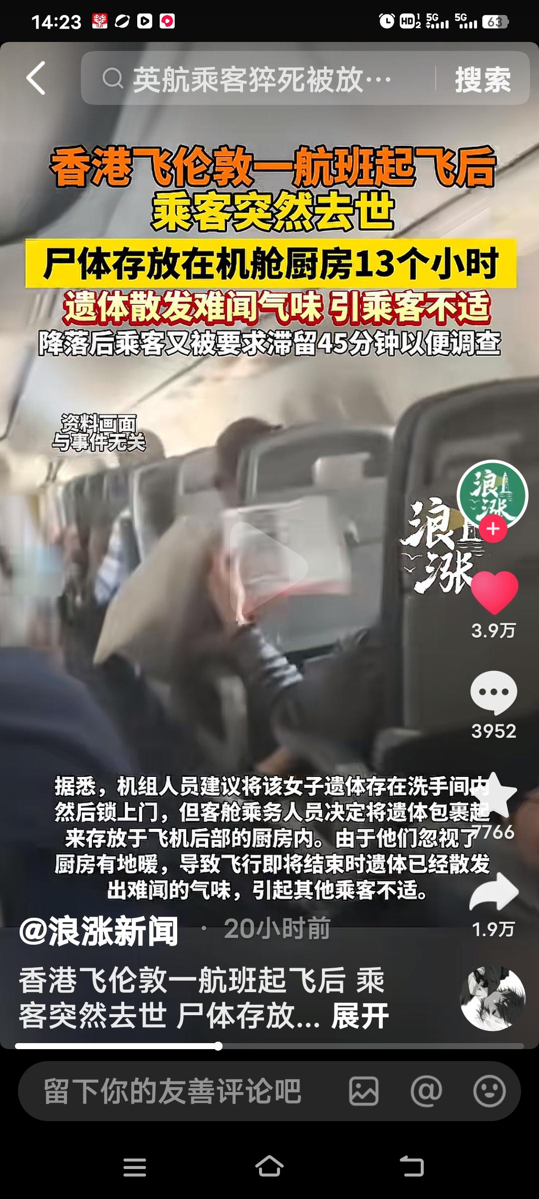 香港飞往伦敦的航班出的这事儿简直离谱至极。一位60多岁的女乘客在飞机起飞30多分钟后便不幸离世,可航班竟未返航,载着遗体飞行了13个半小时。 机组提议将遗体放置在洗手间并锁门,乘务员却把遗体放在了厨房,还忽略了厨房装有地暖这一情况。结果快抵达伦敦时,331名乘客和机组人员中的许多人都闻到了异味。飞机降落之后,乘客还得在座位上坐45分钟等待警方调查。 知情人士“坦白说道,飞机为何不返航,如果一个乘客死亡那并不被视为算紧急情况”?英国航空公司则回应说:“所有程序都已正确执行。” 但死者为大,既然能返回,为何不返回呢?得理解死者家属的心情啊!这事不可能就这么算了,大家肯定会讨个说法,我们就静待后续发展吧! 香港机场事件 香港机场事故