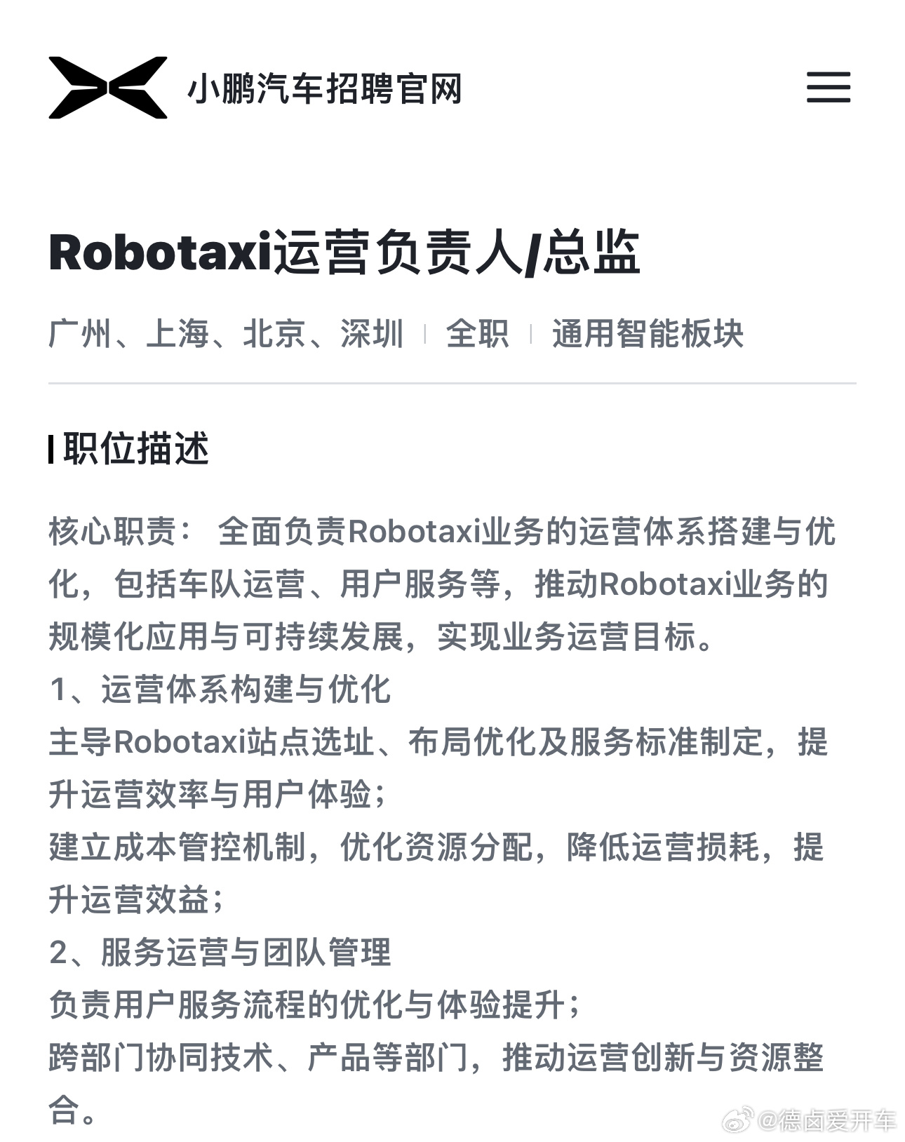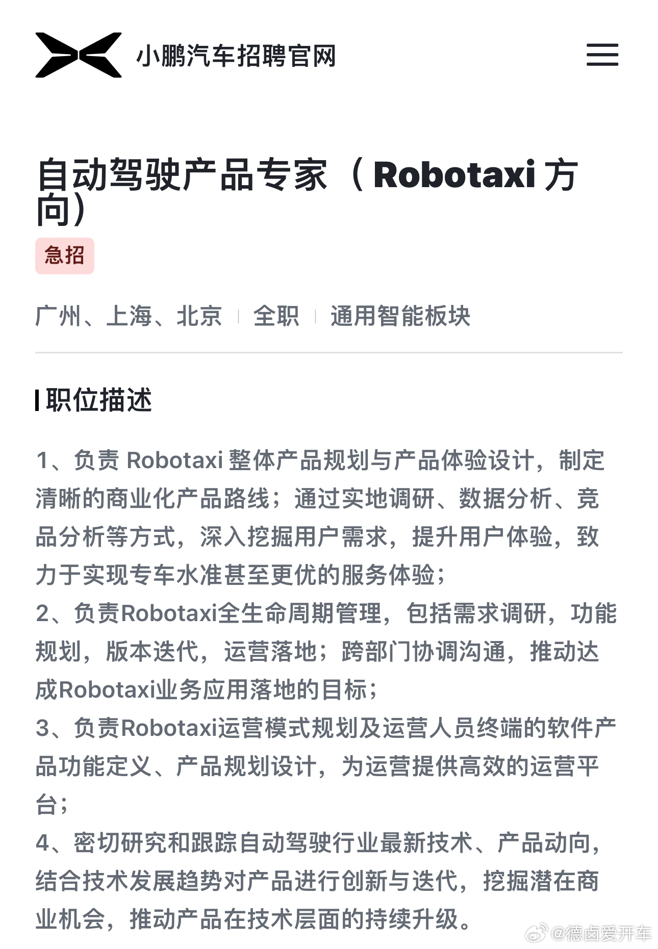 小鹏成立Robotaxi业务部小鹏Robotaxi 正在从0到1的路上,之前还是放在通用智能业务板块中,现在和机器人一样进化为一级业务,今年-明年会先在自营车队验证跑通,后续从1到N就是对外输出整车/软件。