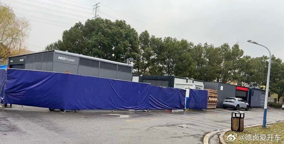 看起来像是蔚来换电站的测试场地,数了下图片中这地方有四座换电站,五代站和曾经的萤火虫站似乎都在。蔚来换电站蔚来