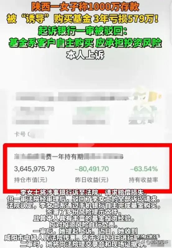 陕西咸阳,一女子手握1000万存款。某银行负责人郑某因存款任务未完成,求女子帮忙存入该行,承诺1年不取保本。女子到银行后,郑某用其手机操作,女子3年后查询发现,存款变成了购买基金,亏损579万。女子起诉,一审驳回诉求,她不甘心提起上诉。 李女士与涉事银行有多年的业务往来,出于对银行机构与工作人员的信任,她没有过多犹豫就答应帮忙。 2021年7月,郑某主动来到李女士的办公场所,全程独自操作李女士的手机完成资金划转与产品认购,整个过程没有向李女士说明产品类型,没有告知任何投资风险,更没有提及基金相关的内容。李女士始终以为自己办理的是约定好的保本存款业务,对资金被投向高风险混合型基金的事实毫不知情。 三年时间里,李女士严格遵守约定没有动用这笔资金,她一直等待一年期满后取回本金,期间从未登录账户查看资金状态。 2024年11月,李女士因家庭资金需求登录手机银行,账户显示的金额让她陷入巨大的震惊与痛苦。1000万元本金仅剩364万余元,累计亏损额度达到579万元,这笔钱被全部投入东方品质消费一年持有期混合A基金,属于中高风险的权益类产品,和保本存款的属性完全相悖。 李女士第一时间联系郑某核实情况,对方不仅没有正视问题,还曾以内部信息为由劝阻她赎回基金,直接导致亏损额度进一步扩大。 她带着完整的账户记录找到涉事银行,银行方面坚持认定产品认购为李女士自主操作,相关风险提示流程完备,损失应当由李女士自行承担,这样的回应让她感受到彻骨的冰冷。 满心委屈的李女士将涉事银行诉至咸阳市秦都区人民法院,要求银行赔偿全部投资损失。一审法院经审理后作出判决,驳回李女士的全部诉讼请求。 法院认定李女士为完全民事行为能力人,具备基金投资经验,风险测评结果适配高风险产品,现有证据无法证明银行存在代客操作、误导销售与保本承诺的行为,涉案亏损属于账面浮动亏损,投资决策由本人作出,应当遵循买者自负的原则。 一审结果给了李女士沉重的打击,她并非不认可投资有风险的基本规则,而是无法接受自己基于信任托付的资金,在不知情的情况下被投向高风险产品。她不愿接受半生积攒的资金凭空蒸发,更不愿让违规操作的一方逃避责任,在整理完全部证据材料后,她正式向咸阳市中级人民法院提起上诉。 二审庭询谈话定于3月23日进行,李女士在上诉阶段补充提交了现场沟通录音与相关佐证材料,试图证明郑某存在代客操作、保本承诺、隐瞒风险的违规行为,同时证明银行未履行金融销售的适当性义务,没有充分保障投资者的知情权与选择权。她的诉求很简单,就是还原事件真相,让责任方承担应有的赔偿,为自己的信任讨一个公道。 这起事件在网络上引发广泛热议,公众的关注焦点并非简单的投资盈亏,而是金融消费场景中信任与责任的边界。 不少人对李女士的遭遇表示同情,认为银行工作人员利用储户的信任完成违规操作,理应承担相应责任。也有部分观点认同一审判决的法律逻辑,强调电子签约与风险测评的法律效力,投资者应当对自身的投资行为负责。 更多普通储户开始反思自身的金融消费安全,大家意识到,即便面对正规金融机构与熟悉的工作人员,也不能放松对资金操作的监管,不能轻信口头承诺而忽视书面流程。 金融机构的适当性义务不该停留在界面提示与电子签名层面,更要落实到真实的风险告知与意愿核实上,不能让信任成为违规操作的保护伞。 李女士的维权之路还在继续,这场纠纷不仅关乎她个人的巨额资金损失,更关乎普通金融消费者的安全感与信任感。当储户将毕生积蓄托付给银行,换来的不是保本的安稳而是巨额亏损,当口头承诺与实际操作完全背离,金融服务的初心与底线就需要被重新审视。 她的坚持不只是为了追回损失,更是在提醒所有金融从业者,信任是金融服务的核心根基,卖者尽责是不可推卸的法定责任,不能用流程合规掩盖真实的误导与违规,更不能让普通消费者为被操控的投资行为买单。 各位读者你们怎么看?欢迎在评论区讨论。