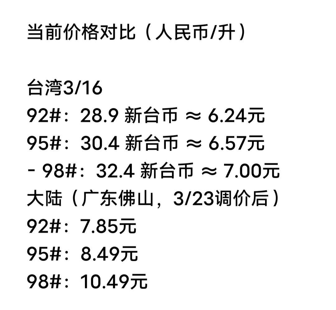 看问题一定要看本质,不能只是光看表面就下结论。仅凭表面的数据就下判断,只会误导消费者,说严重的就是唯恐天下不乱。 按当前(2026年3月23日)价格,台湾汽油零售价确实比大陆便宜,但不能只看单价,还要看税费结构与总养车成本。 当前价格对比(人民币/升) 台湾3/16 92:28.9 新台币 ≈ 6.24元 95:30.4 新台币 ≈ 6.57元 - 98:32.4 新台币 ≈ 7.00元 大陆(广东佛山,3/23调价后) 92:7.85元 95:8.49元 98:10.49元 表面差价:92便宜约 1.6元/升,95便宜约 1.9元/升。 为什么台湾单价这么低呢?原因如下: ① 税费结构完全不同(最关键) 大陆:燃油税、消费税、增值税等全部含在油价里,税费占比约 40%。 台湾:油价不含燃油税,改为按车按年固定征收(燃料税+牌照税)。 例:1.8L家用车,年缴约 3000元人民币,不管开多开少都要交。 结果:单价低,但总养车成本并不低,只是把“加油税”变成“年度固定税”。 ②短期行政干预(冻价+减税) 3/16起台湾冻涨油价,本应涨9.5新台币/升,由“中油”扛亏损。 同时临时减税:汽油每升降3.415新台币,进一步压低零售价 。 只看加油单价:台湾更便宜。 算全年总养车成本:开得少,台湾更亏;开得多,台湾略省。