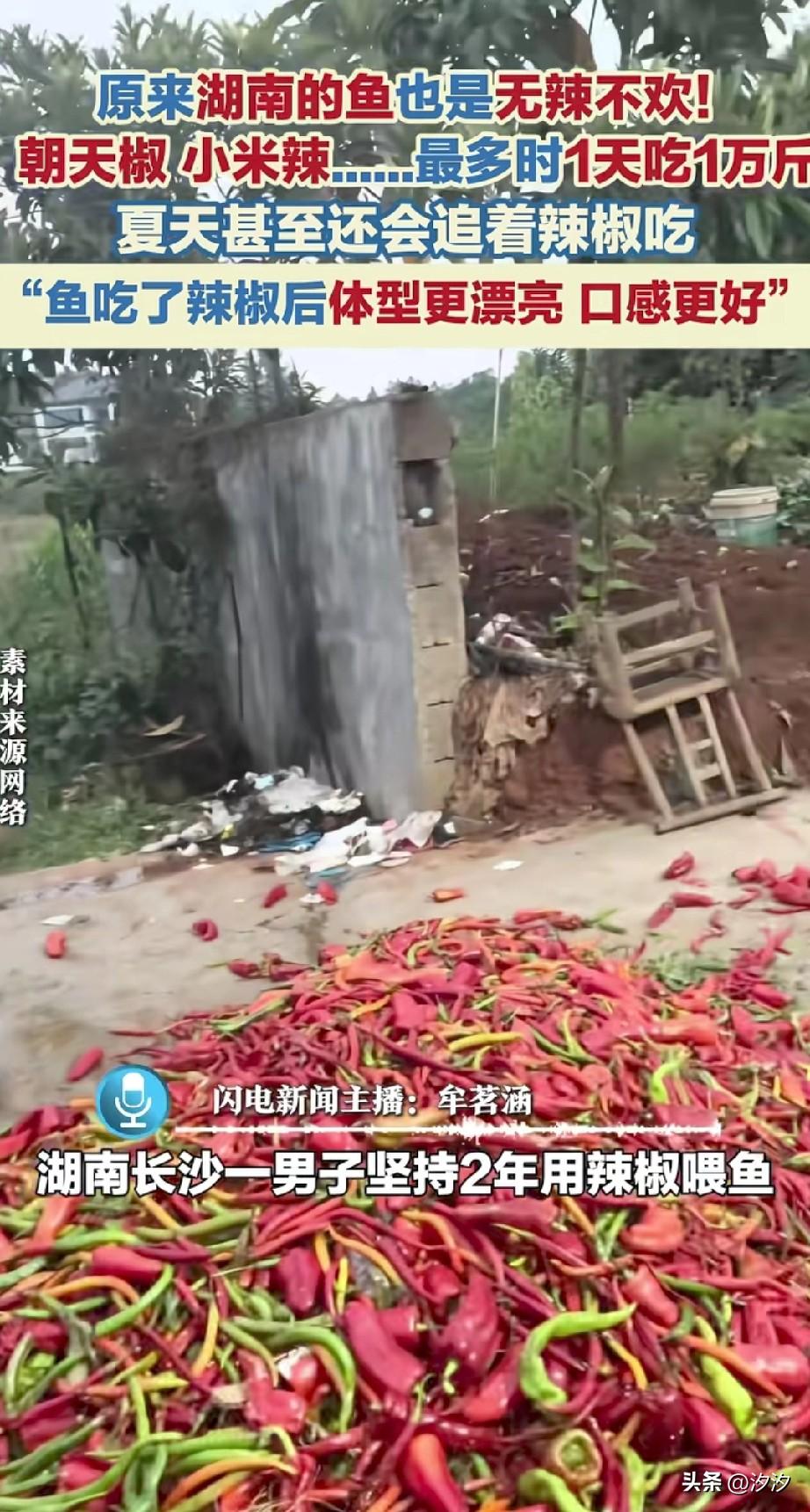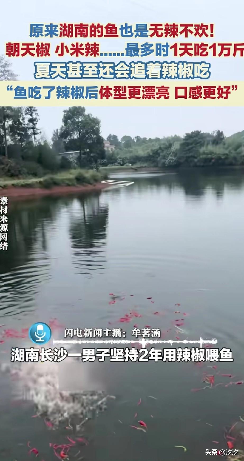 谁能想到湖南的鱼? 居然也是无辣不欢, 湖南长沙的一位养鱼户, 居然两年来坚持一直用辣椒喂鱼, 尤其是草鱼和黑鱼,特别喜欢吃红色辣椒,每个月喂十吨, 最多的时候一天喂1万吨, 这简直太离谱了, 关键辣椒扔进去之后, 鱼群很快就围了上来, 吃的非常的欢快, 辣椒的种类也非常的多, 涵盖了朝天椒,小米辣等多种辣椒, 男子称鱼吃了之后, 长肉非常快, 而且体型更漂亮,味道更鲜, 这样喂出来的鱼, 确实比喂饲料强多了, 如果这个方法真的可行? 想必以后大家都会尝试, 大家觉得湖南的鱼为啥也喜欢不辣不欢? 湖南 吃辣椒的鱼 辣椒养鱼 湖南鱼塘