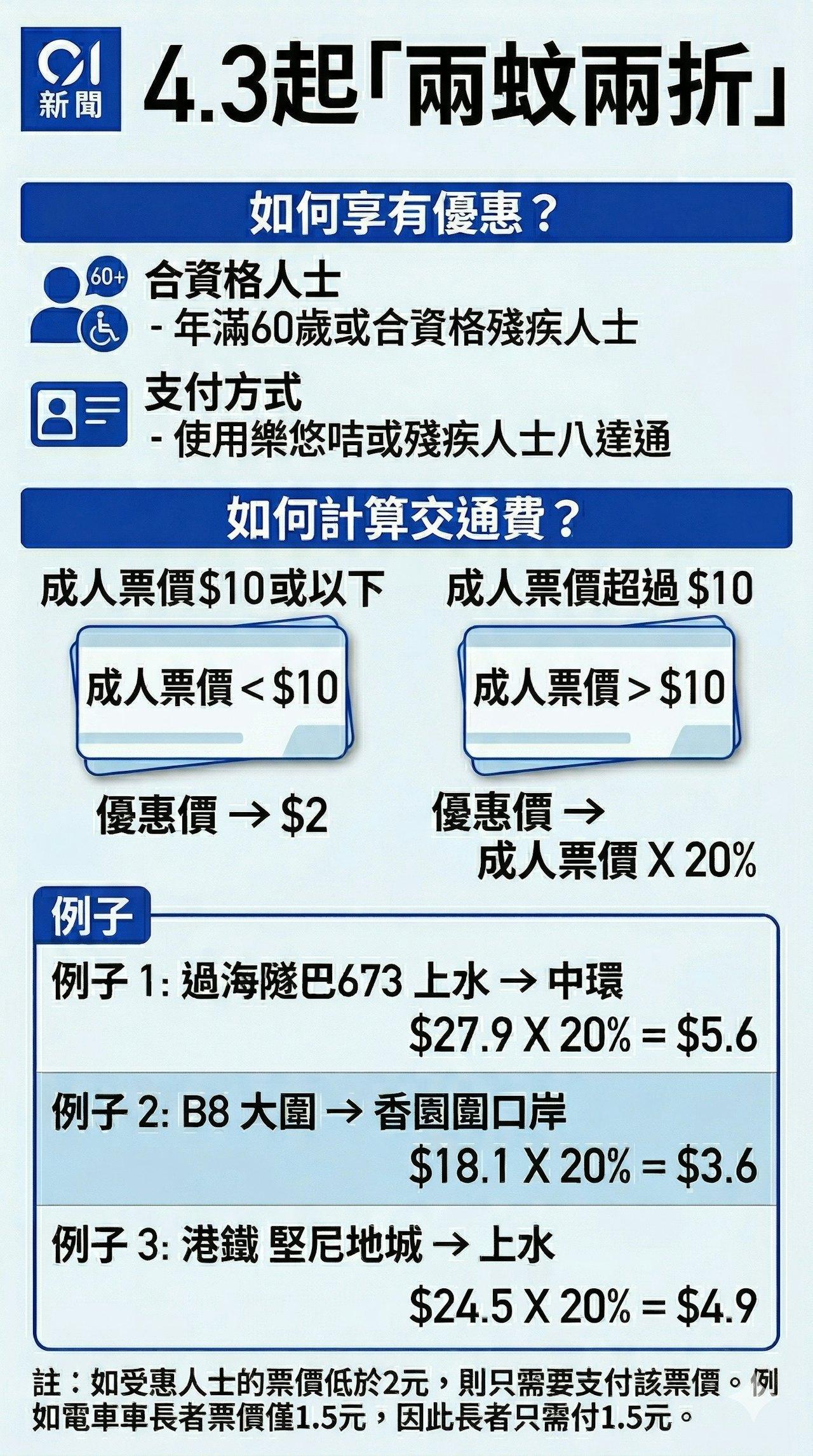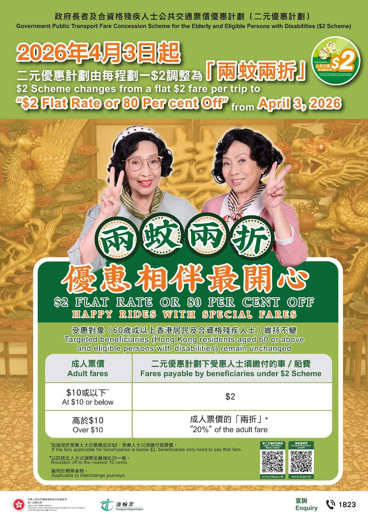香港政府「2元乘车优惠计划」调整 由下月3日起,政府长者及合资格残疾人士公共交通票价优惠计划(二元优惠计划),由二元划一收费调整为「两蚊两折」,即成人票价低于或等于10元,受惠人士维持缴付两元车费,而成人票价高于10元则受惠人士须缴付成人票价的两折,转乘车程同样适用。 「两蚊两折」新安排详情如下: - 实施日期:2026年4月3日起 - 成人票价10元或以下,受惠人士需付车/船费2元 - 成人票价10元以上,受惠人士需付车/船费的「两折」 - 「两蚊两折」适用于转乘车程 - 成人票价的「两折」车/船费,将以四捨五入方式调整至最接近的一毫 「两蚊两折」受惠人士: - 60岁或以上香港居民,必须使用乐悠咭,以享用优惠 - 合资格残疾人士(60岁以下),必须使用印有照片并已加註「残疾人士身分」的个人八达通,才可享用二元优惠计划 - 合资格残疾人士(60岁或以上),应申请及使用乐悠咭,以继续享用二元优惠计划。合资格残疾人士的个人八达通内所加註的「残疾人士身分」设有到期日,转用乐悠咭后将毋须再申请延长「残疾人士身分」到期日以享用二元优惠计划 优惠涵盖的公共交通工具及服务: - 港铁本地服务,包括轻铁服务及港铁巴士(新界西北)路线,不包括机场快线、往返罗湖、落马洲和马场站的东铁线服务及东铁线头等服务 - 九巴、城巴、龙运巴士及新大屿山巴士的专营巴士路线,不包括机场巴士「A」线和「NA」线、马场路线、长途巴士新型服务、特定旅客观光路线及以预约和团体租用形式提供的特别服务 - 指定的渡轮服务,不包括豪华位服务 - 所有电车路线 - 所有专线小巴路线 - 参与二元优惠计划的指定红色小巴路线 - 参与二元优惠计划的指定街渡服务 - 参与二元优惠计划的指定居民巴士服务 香港2元乘车优惠计划香港2元乘车优惠计划调整两蚊两折