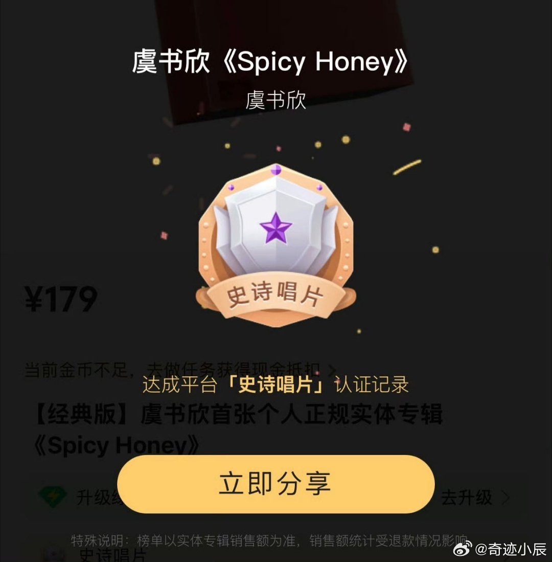 虞书欣内娱唯一史诗唱片女歌手 恭喜虞书欣成内娱唯一史诗唱片女歌手!《Spicy Honey》成绩实打实,演员歌手两手抓,坚守音乐初心,期待歌手欣更多惊喜! 虞书欣